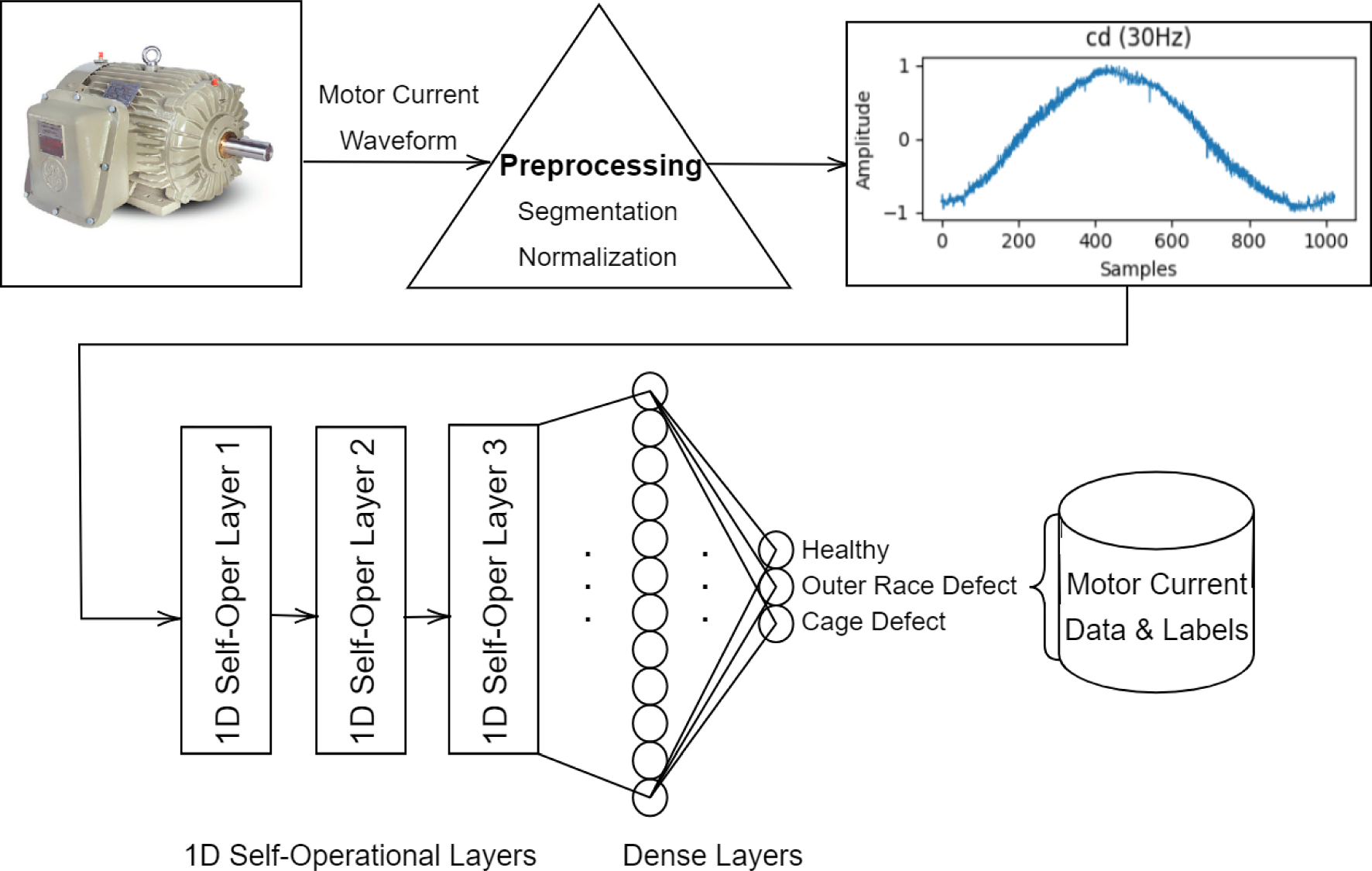 In this study, we compare the performance of state-of-the-art 1D Self-ONNs with commonly used 1D CNNs for bearing fault detection and classification using raw current data in ASD-fed machines. Figure 1 provides an overview of the implementation process for our proposed method. It details the preprocessing steps, including segmentation and min-max normalization, with an example output waveform to illustrate data transformation. The figure also outlines the architecture of the 1D Self-ONN, highlighting its three self-operational layers and two dense layers, and presents the final output with possible predictions. With the proposed pipeline, our aim is to demonstrate that 1D Self-ONNs offer competitive diagnostic performance while significantly reducing computational complexity. To offer a more robust solution, Self-ONNs integrate feature extraction and classification into a unified framework by utilizing the motor’s raw current data. Its lower computational complexity makes it well-suited for real-time implementation in embedded systems as well.