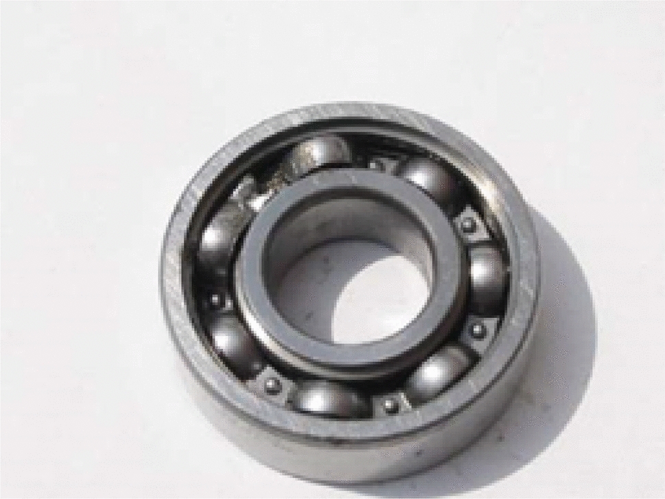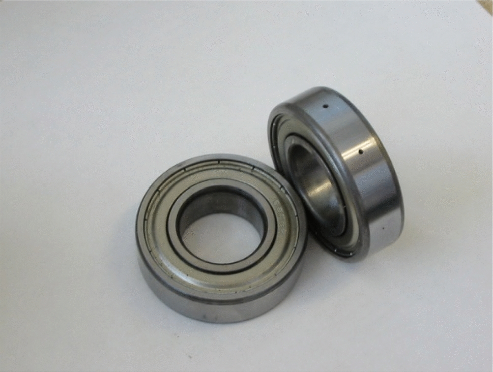 For the cage defect, the bearing cage was intentionally deformed by pressing a center punch between two adjacent balls, disrupting the usual rotation of the cage. To simulate an outer race defect, a radial load was applied using a belt-driven mechanism. In this experiment, a single 1/32 inch diameter hole was drilled into the outer race to generate a consistent defect for testing purposes. The bearings with cage defect and outer race defects (depicted with 2 holes) are shown in Figs. 4 and 5, respectively. These illustrations are for reference purposes; in the actual test, the outer race had only one 1/32 inch diameter hole.