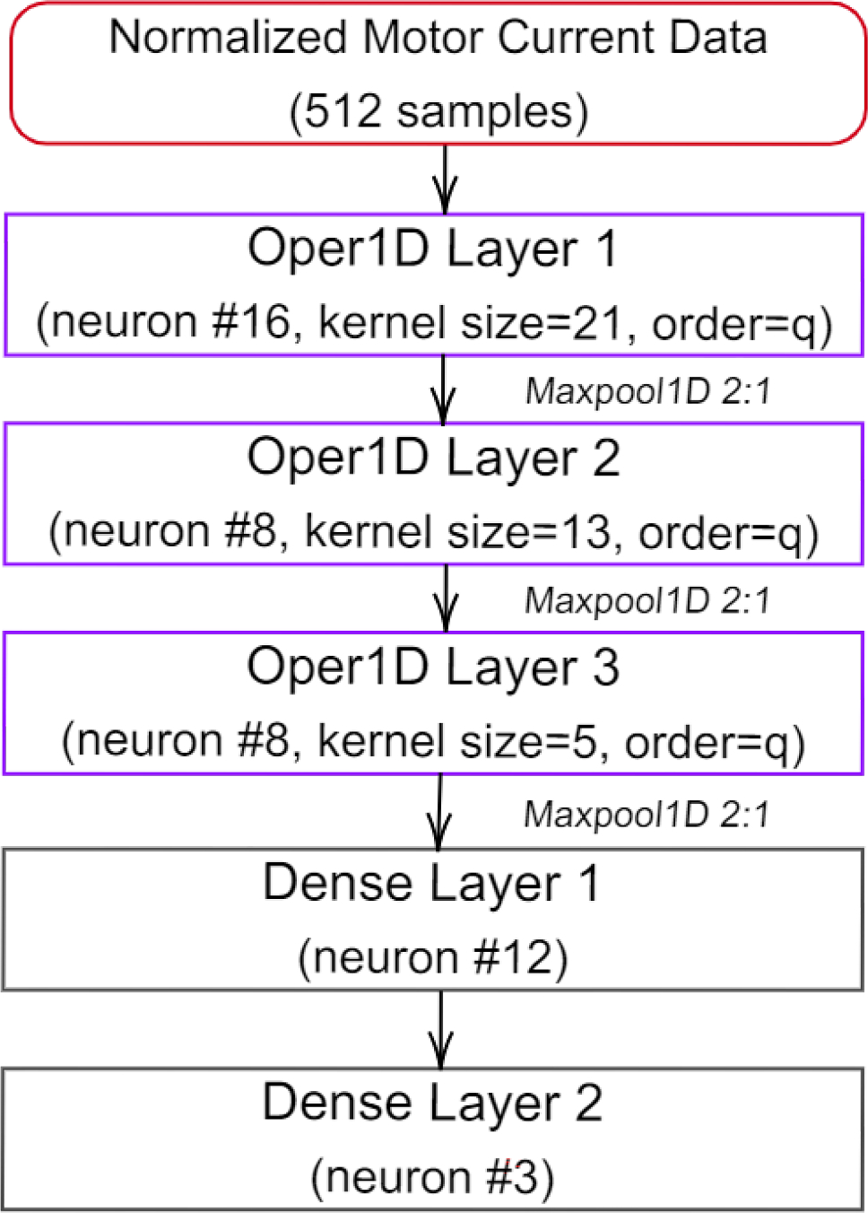 Our study explores the impact of varying the polynomial degree \( q \) in the 1D self-organized operational layers (Oper1D), testing \( q \) values of 1 (i.e., Conv1D), 3, and 5 to analyze how higher polynomial terms affect the model’s ability to capture complex patterns in the motor current signature for each case.