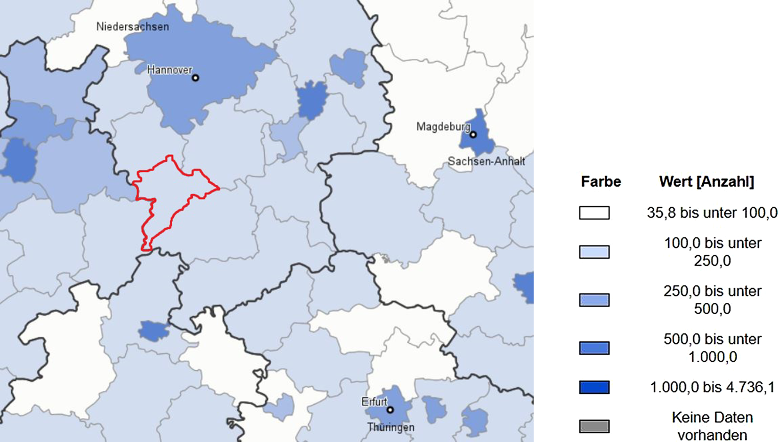 Der Landkreis Holzminden im südlichen Niedersachsen. (Quelle: Regionalatlas Deutschland. Statistische Ämter des Bundes und der Länder, Deutschland, 2020); Indikatoren des Themenbereichs „Bevölkerung“; Bevölkerungsdichte (Einwohner je qkm); Jahr 2018, Kreise und kreisfreie Städte; 5 Klassen, manuelle Klassifizierung