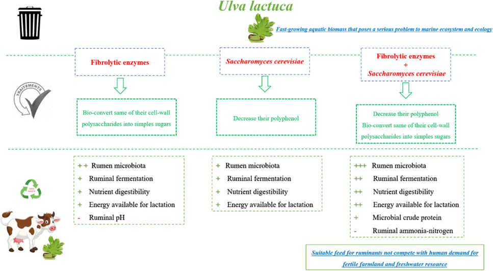 Bioconversion of green algae Ulva lactuca biomass with Saccharomyces cerevisiae yeast and exogenous fibrolytic enzymes into suitable ruminant feed