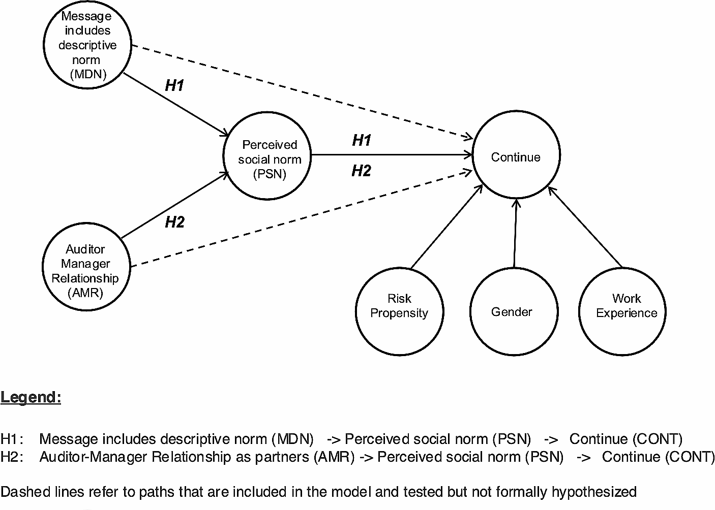 Brown and Fanning (2019) suggest that future research could also investigate different types of persuasion techniques that internal auditors could use to make their recommendations more persuasive to managers, such as informational social influence (Cialdini, 1984) and how they influence manager behavior. Following this call for further research, in our study we build on the prior work of Nuijten et al. (2016) and examine how both AMR and nudging with a descriptive norm can shape perceived social norms, thereby helping internal auditors to become more persuasive in bringing their message to managers’ attention. More specifically, we test the idea that internal auditors could follow a combined approach in bringing their message to managers. First, they can add a descriptive norm to the message and tell what the manager’s peers would do in this situation. This approach is consistent with Cialdini (1984) and Cialdini and Goldstein (2004) who also used messages containing descriptive norms that describe what others do, or the behaviors they engage in. Second, internal auditors can develop a relationship with the manager such that the auditor is viewed as a ‘partner’ rather than an ‘opponent when they communicate the message to the manager. We elaborate the idea that both elements can shape the manager’s perception of a social norm. Social norms are the accepted standards of behavior of social groups (Cialdini, 1984; Cialdini & Goldstein, 2004). In the context of our study, social norms refer to whether it is found acceptable to push further a risky course of action or not.