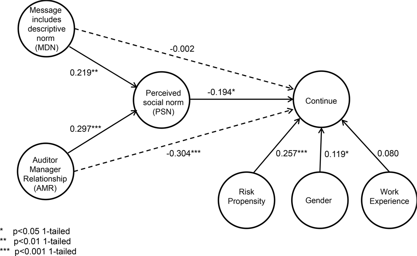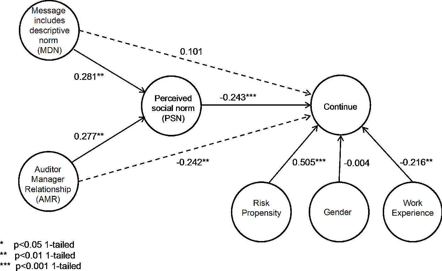Table 9 shows that the explanatory power of our structural model is adequate with an R-squared of 0.258 for our dependent variable Continue. As shown in Fig. 3; Table 9, the Descriptive Norm (MDN) to Perceived Social Norm (PSN) path is significant (path coefficient of 0.219 and p = 0.001), the path from Auditor-manager Relationship (AMR) to Perceived Social Norm (PSN) is significant (path coefficient of 0.297 and p < 0.001), and the path from Perceived Social Norm (PSN) to Continue is significant (path coefficient of -0.194 and p = 0.016). The direct path from AMR to Continue is also significant (path coefficient of -0.304 and p < 0.001).