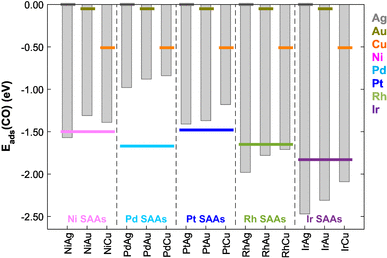 Adsorption energies (Eads) of CO on the most stable sites of SAA (111) surfaces. Corresponding values of Eads for pure metal (111) surfaces are shown by coloured horizontal lines [Ag (grey), Au (gold), Cu (orange), Ni (pink), Pd (cyan), Pt (blue), Rh (green) and Ir (purple)]