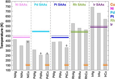 Peak desorption temperatures from KMC simulated TPD of CO on SAA (111) surfaces. Temperatures from pure metal simulations are shown as full-horizontal lines whereas corresponding temperatures from experiment [55‐58] are shown as dotted-horizontal lines [Cu (orange), Ni (pink), Pd (cyan), Pt (blue), Rh (green) and Ir (purple); Au and Ag not shown due to weak or no CO binding]. Experimental SAA temperatures are shown with diamonds [16, 18, 21, 55]
