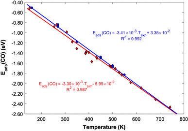 $${E_{ads}}(CO)=~ - 3.30 \times {10^{ - 3}} \cdot {T_{sim}} - 5.95 \times {10^{ - 2}}$$
