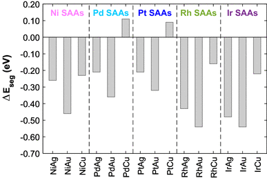 We perform calculations for each binary alloy in structures where a single dopant atom is in the surface layer (i.e. a SAA) or immersed in the bulk material. For the latter, we approximate the “bulk” as a single dopant atom in the 3rd layer of the host material slab such that the dopant atom is fully coordinated to host atoms and the slab is symmetric. The segregation energy \(\Delta {E_{seg}}\) is then computed relative to the SAA phase such thatwhere \({E_{Tot}}(bulk)\) and \({E_{Tot}}(SAA)\) are the DFT total energies of the single dopant atom immersed in the 3rd layer of the host material slab and the single dopant atom in the surface layer of the host slab respectively. Note that positive values of \(\Delta {E_{seg}}\) correspond to a preference for segregation of the dopant to the surface, not accounting for entropy.