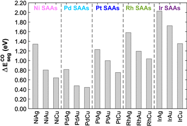 In the presence of CO, our calculations suggest that it is strongly favoured for a single dopant atom to segregate to the surface. To deduce an expression for the segregation energy, we consider a cyclic process entailing: (i) desorption of CO from an alloy structure with the dopant in the bulk, (ii) segregation of the dopant in the surface, (iii) adsorption of CO in the dopant site of the SAA, and (iv) migration of the dopant back to the bulk in the presence of CO, such that the final state is identical to the initial configuration (see supporting information). The CO induced segregation energy \(\Delta E_{{seg}}^{{CO}}\) is therefore given as: