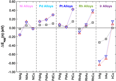 The energy of aggregation \(\Delta {E_{agg}}(n)\) relative to the SAA phase for the clustering of group 10 dopant atoms in the (111) surface of group 11 metals into dimers (black squares) and trimers where dopant atoms surround fcc (red up-triangles) and hcp (blue, down-triangles) sites