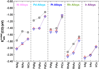 Adsorption energies of a single CO molecule in the most energetically favourable surface site for dimers (black squares) and triangular trimers surrounding fcc (red up-triangles) and hcp (blue down-triangles) of binary alloy combinations of Ni, Pd, Pt, Rh and Ir doped into group 11 (111) surfaces
