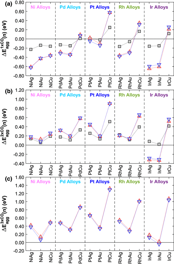 In order for a single CO molecule to induce aggregation, the adsorption energy of CO on an n-mer island \(E_{{ads}}^{{n{\text{-}}mer}}(CO)\) must be more negative than that on a SAA and the difference must also offset positive values of \(\Delta {E_{agg}}(n)\) to make the CO induced aggregation energy \(\Delta E_{{agg}}^{{m \times CO}}(n)\) negative (Fig. 8a);