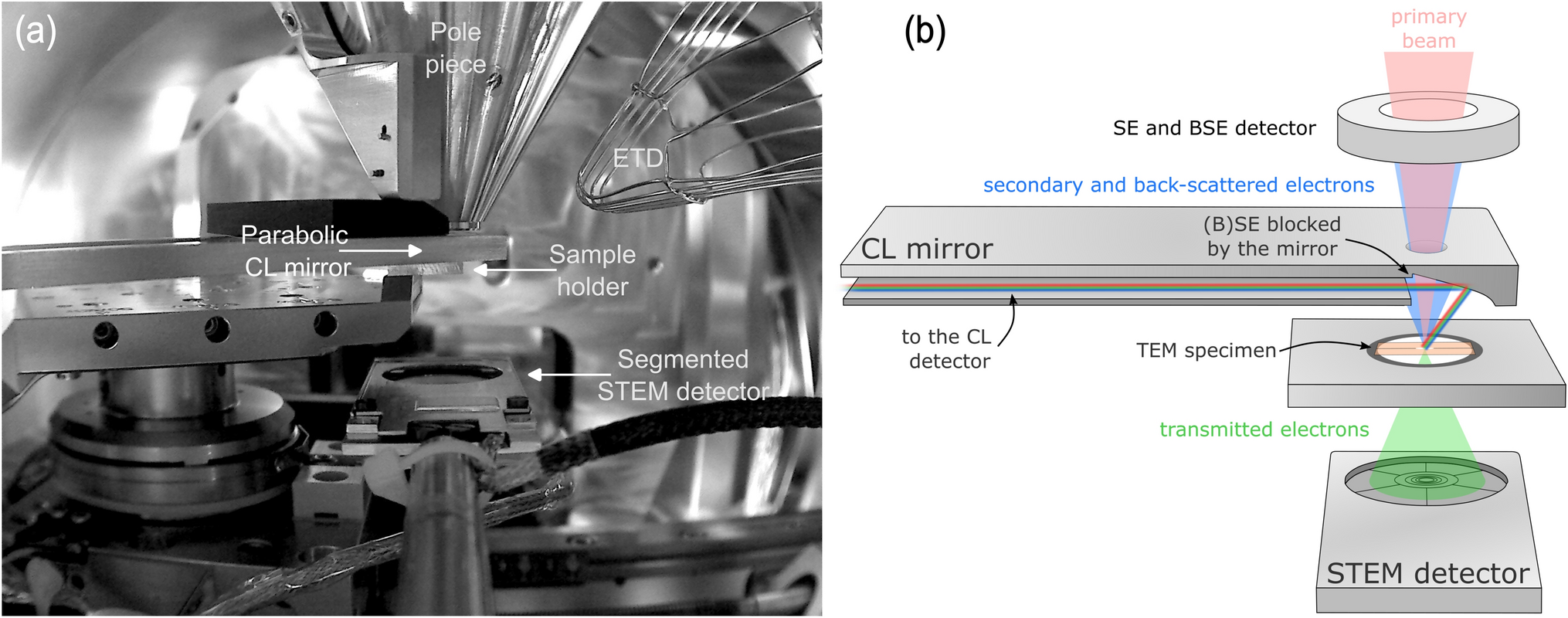 (a) Chamber view with inserted STEM detector and CL mirror. The sample holder is sandwiched in between. (b) Schematic illustration of the setup with signals generated by the primary beam shown. ETD is the Everhard Thornley chamber detector.