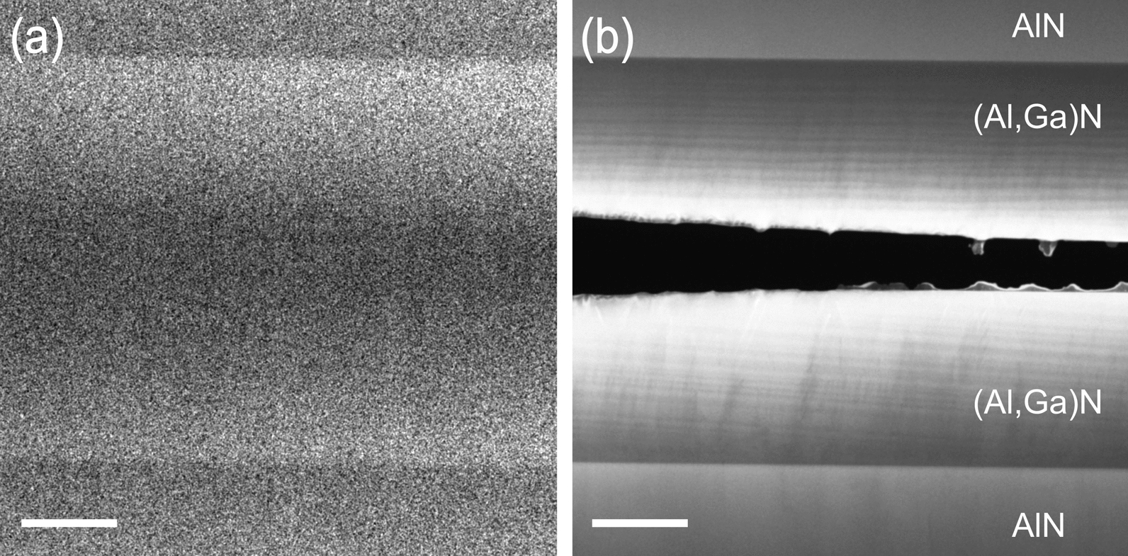 The panchromatic CL image in Fig. 5a exhibits periodic intensity variations in the (Al,Ga)N layer along the growth direction which are also visible in the HAADF image in Fig. 2b. The latter suggests chemical composition fluctuations as the origin. For the upper sample piece, where the <11–20> direction is parallel to the beam, the resulting lines are approximately parallel to the AlN/(Al,Ga)N interface. For the lower sample piece, where the beam is parallel to the <1–100> direction, they are inclined at an angle of about 4°. To quantify the composition variations, a series of 2 nm bandpass images were recorded in the spectral range between 230 nm and 270 nm. To compensate for sample drift, the CL images were registered using the simultaneously acquired HAADF image series using the FIJI code.14 The image series was converted into a false-color RGB image for presentation purposes, with blue (red) components representing shorter (longer) wavelengths, as displayed in Fig. 5b. The emission peak is centered around 253 nm, which corresponds to a mean Al content of x = 0.65, using Vegard’s law and the parameters given in Ref. 15. The analysis of the shift of the center of mass of the emission along the growth direction, reconstructed from the image series, yields a variation of the emission peak of approximately ± 1 nm and a period length of around 100 nm. This corresponds to a composition variation in the range of about ±1%, assuming that the spectra are excited from the individual layers. Details about the compositional fluctuations are shown in the supplementary Figure S3. Apart from the periodic composition modulation, both sample pieces reveal a blueshifted emission directly at the (Al,Ga)N/AlN interface, indicating decreasing Ga content in the early stages of the growth.