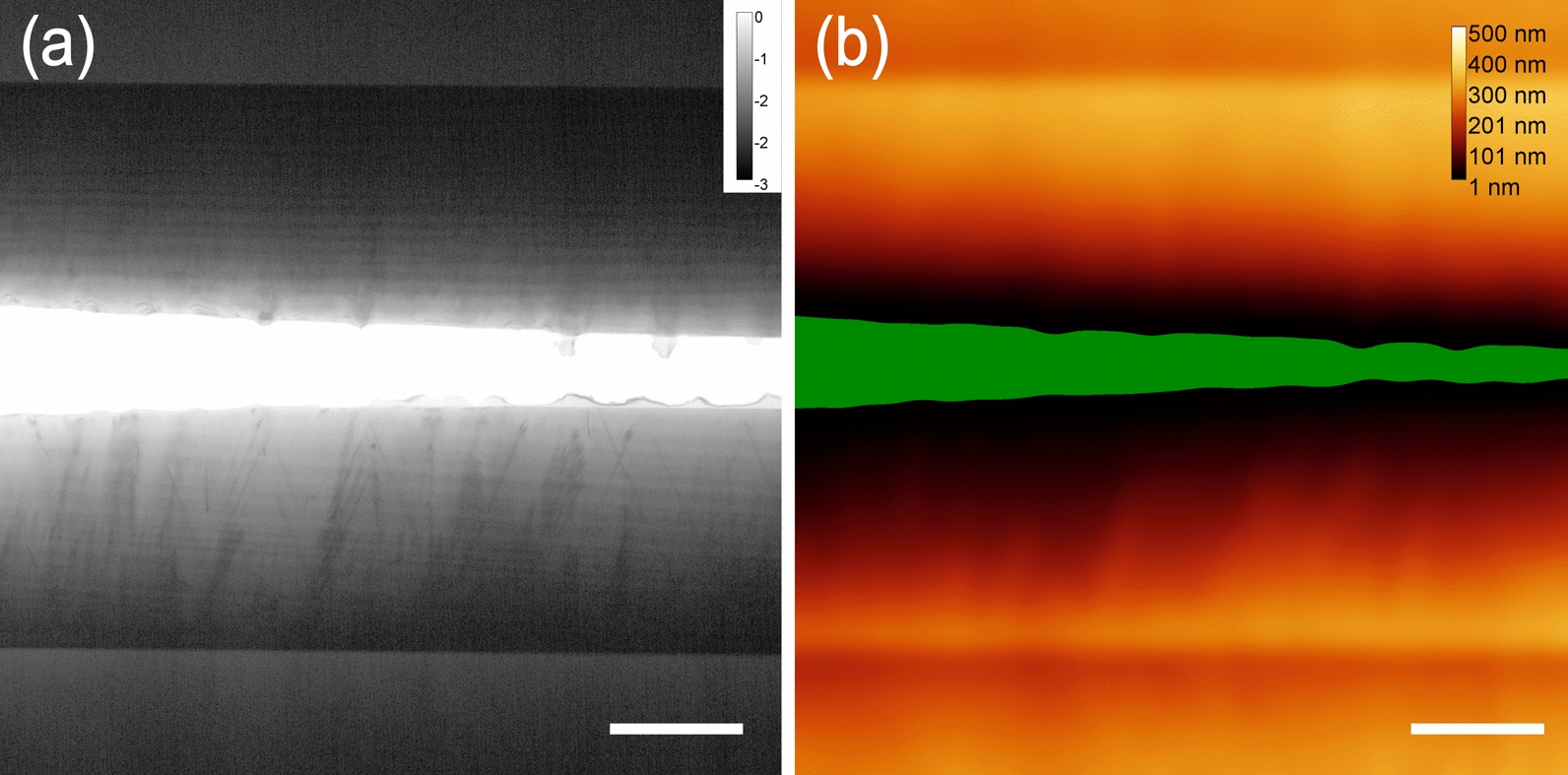 (a) BF STEM image displayed on logarithmic intensity scale. Beam settings were 30 keV, 1.6 nA, and a dwell time of 64 µs. Lower sample piece corresponds to the <1-100> zone axis, upper to the <11-20> zone axis. (b) Thickness estimation from the quantified BF intensity in combination with Monte Carlo Simulations. The indicator equals 1 µm.