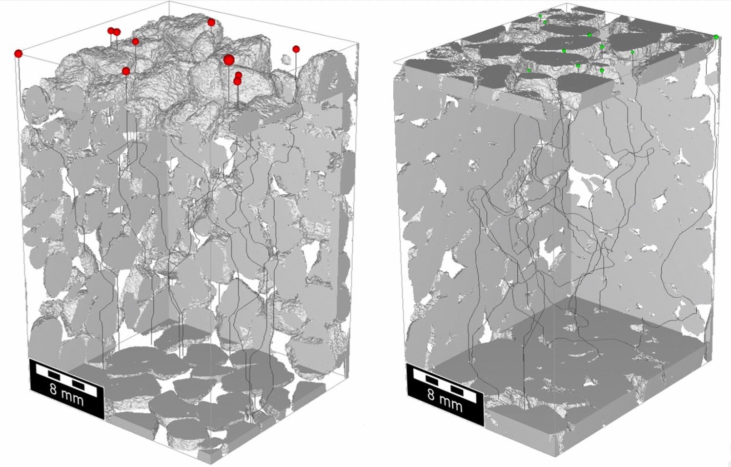 Percolation Path in the uncycled bed (left) and the cycled bed (right)