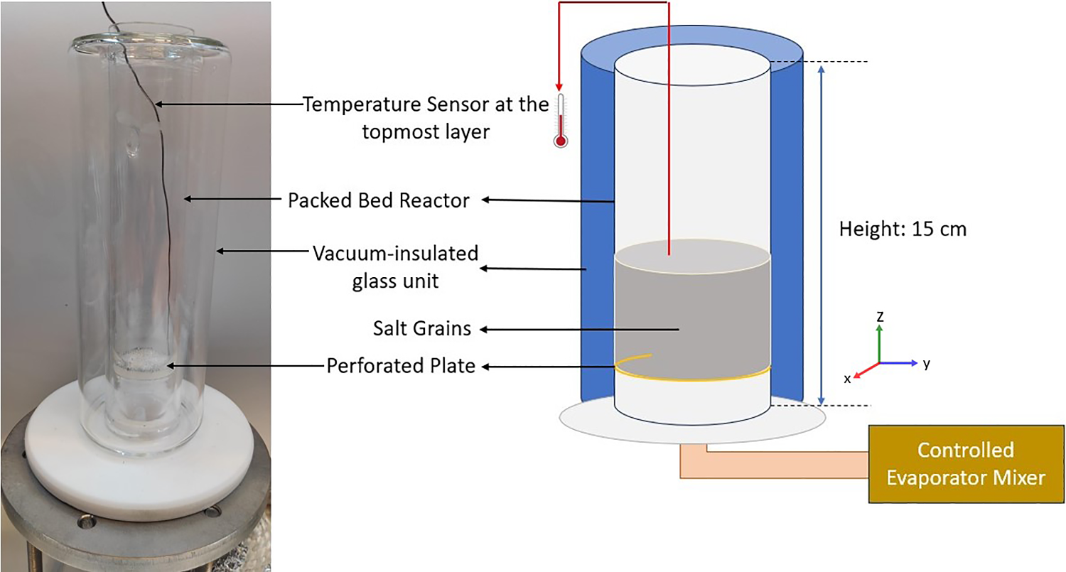 The tested packed bed reactor, developed at the University of Twente, has an outside vacuum-insulated glass unit to prevent heat loss during the hydration and dehydration of the material. The experimental setup and the schematic are shown Fig. 2. A plate is attached to the bottom of the reactor to prevent further heat loss for incoming air. The reactor is connected to a controlled evaporator mixing unit (CEM). The CEM unit provides dry and humid air at given temperature and humidity conditions. The operating conditions used for the experiment are presented in Table 1. At the top of the reactor, a thermocouple is connected to measure the temperature change at the outlet. An optical Keyance digital microscope(VHX-970FN) [26] has been connected at the side of the reactor to continuously monitor the swelling and shrinkage of the material.
