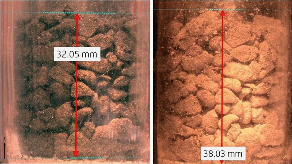Images of (left) the uncycled and (right)cycled bed showing the height change after 10th hydration cycle