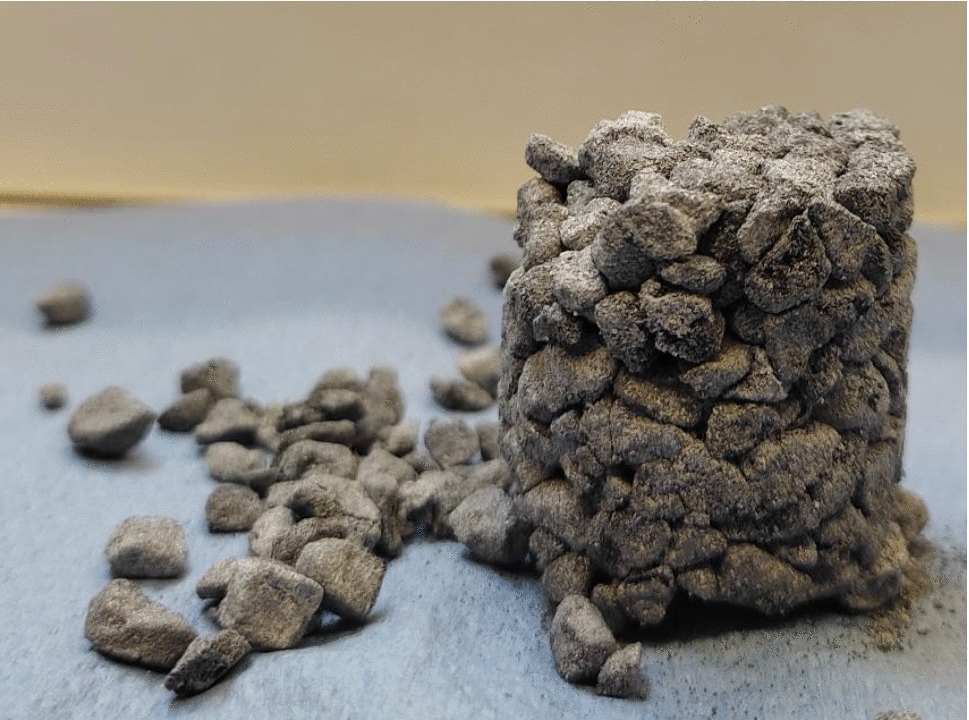The packing has even smaller and less diverse pore sizes, ranging from 0 to 1.5 mm but they constitute a large volume fraction. Agglomeration and swelling of grains after cycling resulted in low void fraction meaning that the packed bed is now densely packed, which can increase the pressure drop in the reactor. However, a high number of small pores can also cause diffusion limitations and mass transfer resistance, which can lower the reaction efficiency.