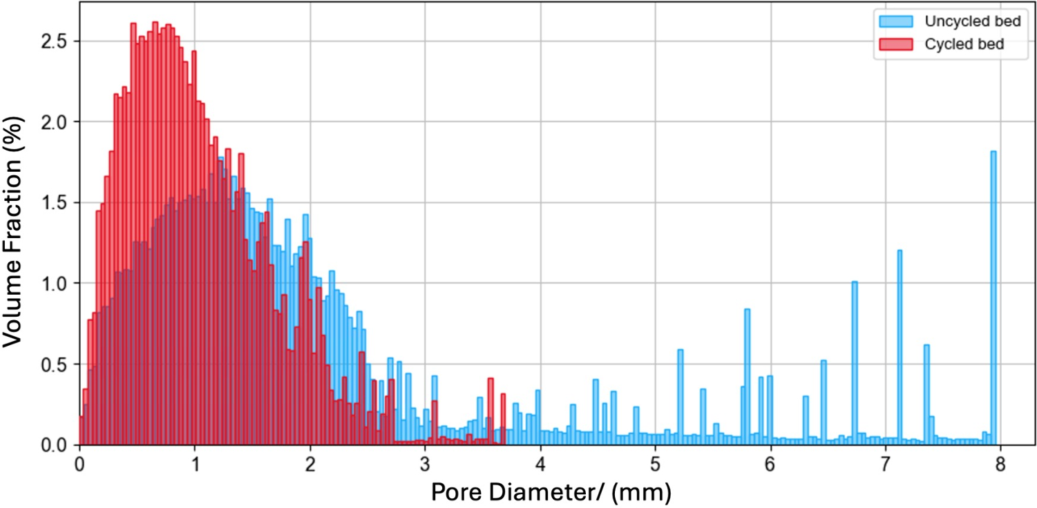 Pore Diameter Distribution with Corresponding Volume Fractions in the uncycled bed (blue) and cycled bed (red) after 10 cycles