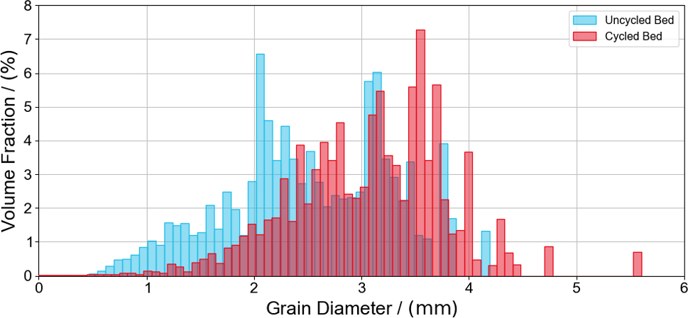 Grain size distribution for both uncycled and cycled beds is shown in Fig. 7. The grain diameter is the average size of grains in the bed, measured in millimeters. On the y-axis is the volume fraction of grains of a given size, which is the percentage of the total volume of the bed that is occupied by grains of that size. Both the figures show that the grain size distribution in an uncycled packed bed is typically unimodal, meaning that there is a single most common grain size. The general trend is grain diameter ranges from 0.5 to 4 mm in the uncycled bed but in the cycled it is from 0.5 to 5 mm, indicating the occurrence of agglomeration after cycling. The shape of the grain size distribution curve is influenced by several factors, including the packing process, the shape of the grains, and the presence of any fines (very small grains) in the bed.