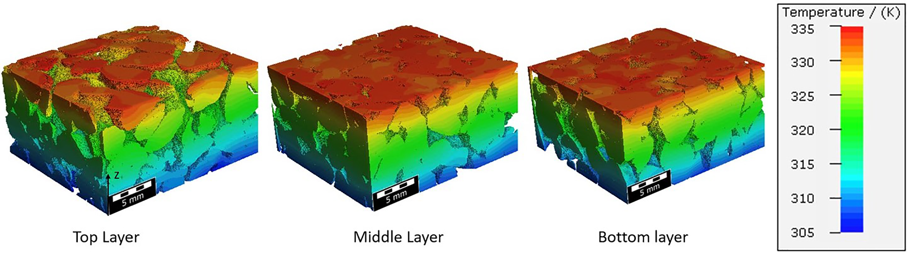 To prevent ambiguity due to the presence of a few particles at the top and their contribution to thermal conductivity, a set of voxels was not selected in the topmost layer. Every layer is shown in Fig. 9 has a length of 11.6 mm. For each layer effective thermal conductivity is calculated separately using the same boundary conditions. The temperature distribution in each layer is comparatively similar, except for a slight variation observed in the top layer, which can be attributed to changes in the effective thermal conductivity value. In Table 5, it can be seen that the effective thermal conductivity in the Z-direction is less compared to other directions. This is due to the presence of more void space in the Z-direction. Additionally, the swelling and shrinkage of grains during hydration and dehydration are limited in horizontal directions due to the presence of the wall of the reactor thus, resulting in more vertical size variation.