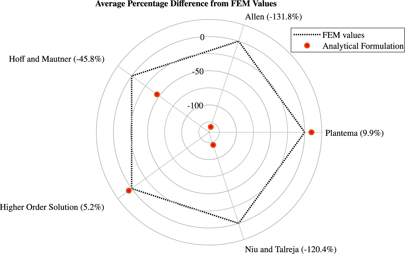 In order to perform a comparative assessment of the various analytical formulations listed in Table 3, alongside the higher-order solution and the FEM results, a radar-type comparison graph has been used as shown in Fig. 10. This graphical representation illustrates the relative percentage deviation between the buckling load values predicted by each analytical model and the corresponding FEM results. The degree of agreement between each formulation and the FEM reference is thereby visualized, with a perfect correlation being represented by the dotted reference line.