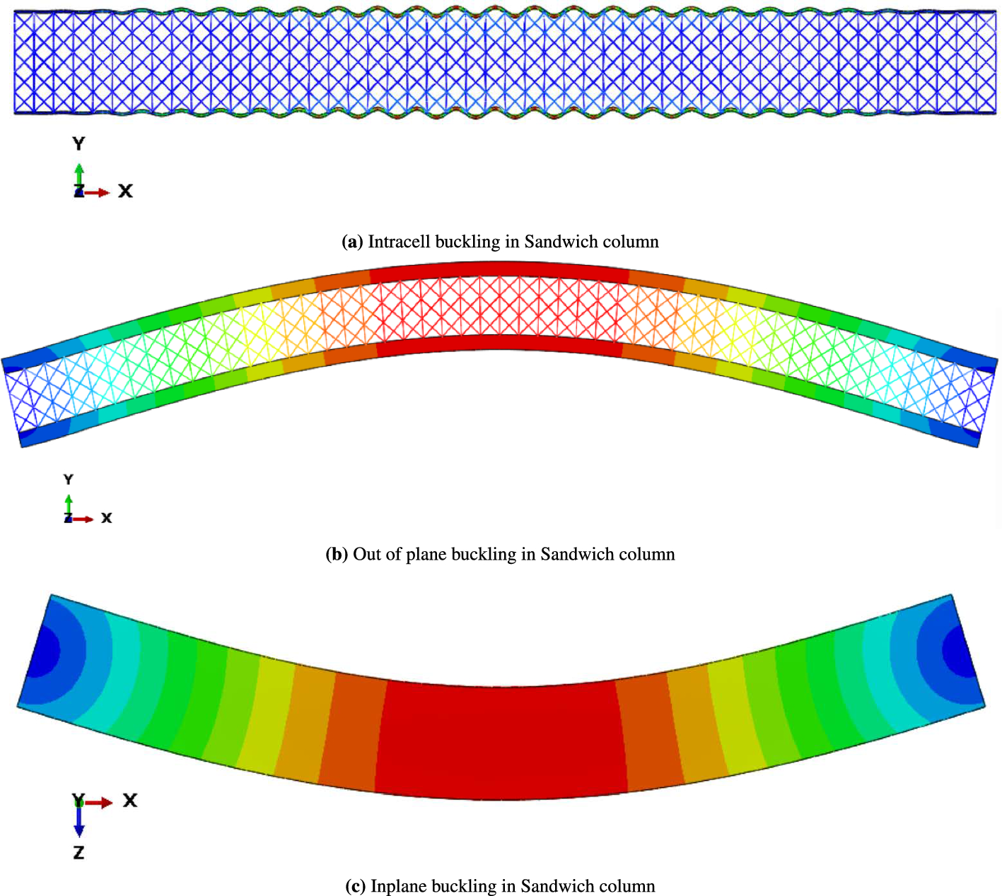 Under uniaxial compressive loading, both global and local failure modes were observed in the sandwich column. The analysis considered in-plane and out-of-plane global buckling as well as intracell and wrinkling local buckling failure modes, which were examined separately using both analytical methods and FEM. The subsequent sections present a detailed exploration of these failure modes and the corresponding solutions. In the context of wrinkling analysis, it was found that existing solutions in the literature did not converge to FEM results within acceptable error margins. To address this limitation, the study introduces an original displacement formulation, as detailed in the section on wrinkling, which yields significantly improved results, thereby demonstrating the originality and contribution of this work.