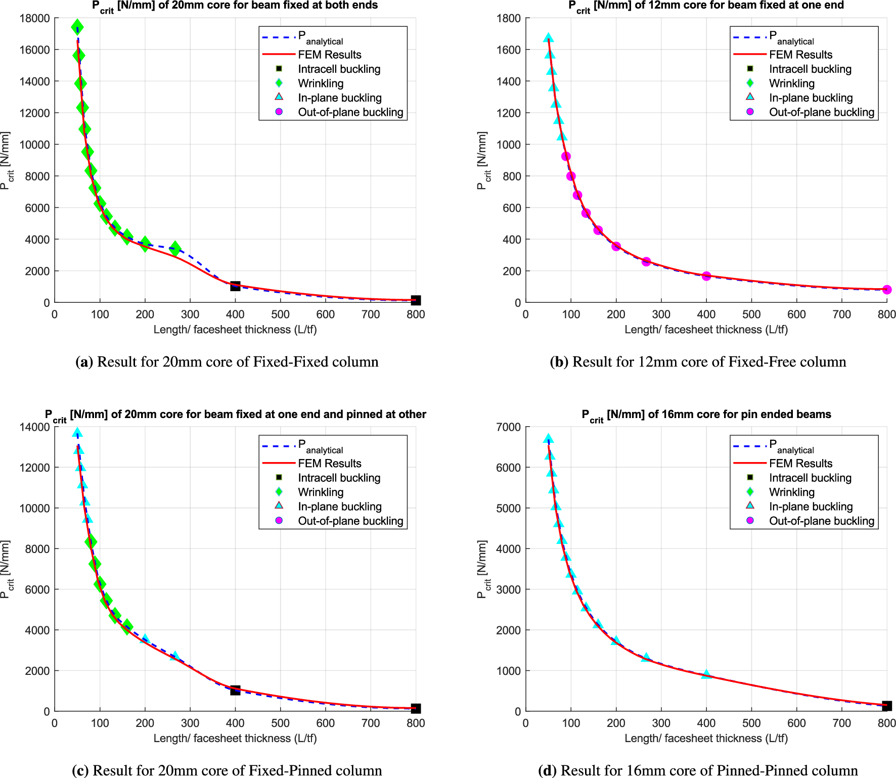 Intracell buckling, illustrated in Fig. 11a, was observed only under boundary conditions other than fixed-free. Specifically, it occurred for facesheet thicknesses of \(0.25,\text {mm}\) and \(0.5,\text {mm}\), as seen in Fig. 12a, c, d. This indicates that intracell buckling is confined to cases where the facesheet is sufficiently thin. FEM simulations further reveal the presence of both symmetrical and antisymmetrical intracell buckling modes. Symmetrical buckling occurs when the number of lattice layers in the thickness direction is even, whereas antisymmetrical buckling arises when the number of layers is odd. Notably, existing literature does not distinguish between these two forms of intracell buckling. Despite this, the analytical model–based on Zenkert’s formulation–offers a quantitative prediction of intracell buckling, demonstrating the model’s ability to accurately capture these local buckling behaviors.