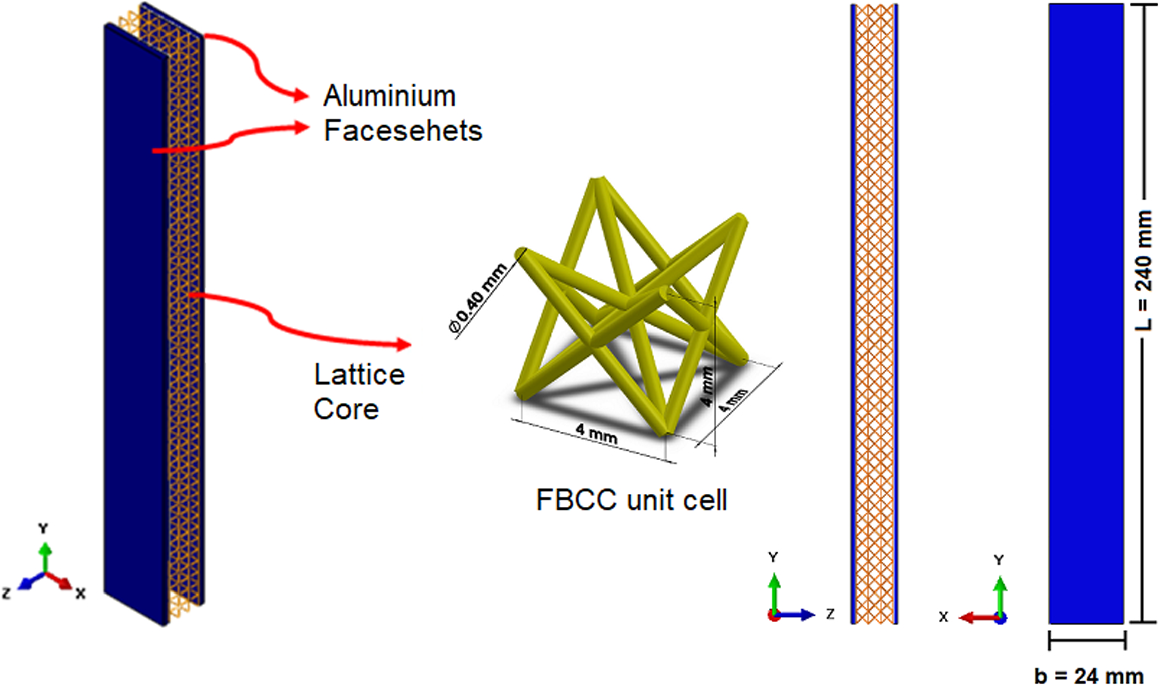 It is assumed that the facesheet and lattice core materials used in the sandwich structure design will be produced using AlSi10Mg powder with LSM. The dimensions of the sandwich structure and unit cell are presented below (Fig. 1). Because the sandwich is considered to be produced in an integral design, and the core and facesheet are composed of the same material (AlSi10Mg), there is no need for any adhesive.