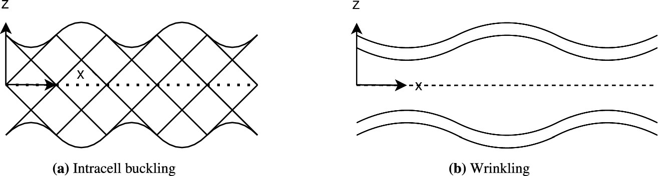 Local buckling is a structural instability phenomenon that occurs within specific regions of a sandwich structure, as opposed to global buckling, which involves deformation of the entire structure. Local buckling is characterized by localized deformations within the core or face sheets, which can significantly decrease the load carrying capacity of the structure and lead to premature failure. One of the most common forms of local buckling in sandwich structures is the buckling of the face sheets, which typically occurs as either intracell buckling or wrinkling. The key distinction between these two buckling modes lies in their respective wavelengths. Intracell buckling is associated with shorter wavelengths and often occurs when the face sheet is thin or the core features small, closely spaced cells, such as in lattice or honeycomb cores. Wrinkling, on the other hand, involves longer wavelengths and is more prevalent when the core is relatively compliant or thick (Fig. 3).