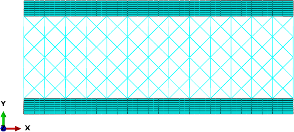 Meshing is carefully tailored to the geometry and dimensions of the sandwich column to ensure mesh-independent buckling load predictions. A mesh convergence check was performed and showed that the predicted critical loads remain unchanged with reasonable refinement. Quadratic solid elements with reduced integration (C3D20R), with a mesh size of \(0.5\,\text {mm}\), are used for the facesheets in order to avoid unnecessary computational effort. The core lattice is modeled using linear beam elements (B31) with a mesh size of \(2\,\text {mm}\). Depending on the facesheet thickness, between 6 and 12 solid elements are used through its thickness to capture local buckling behavior accurately. A sample meshed section with a \(20\,\text {mm}\) core and \(3\,\text {mm}\) facesheet is shown in Fig. 7. This FEM strategy enables high-accuracy modeling of geometric complexity and anisotropic material behavior, captures both global and local buckling phenomena, and supports parametric studies across various core and facesheet dimensions. The numerical results are compared with analytical predictions to assess the validity of the proposed models. The four boundary conditions investigated in this study include fixed–fixed, fixed–pinned, pinned–pinned, and fixed–free.