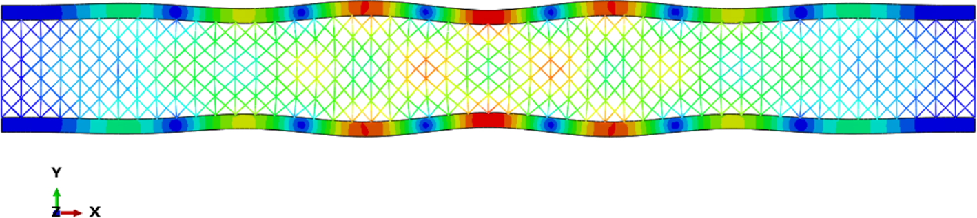 Wrinkling was observed in the sandwich column under both fixed–fixed and fixed–pinned boundary conditions. In particular, the critical wrinkling load obtained from the FEM analysis remained unchanged under different boundary conditions. This observation indicates that the onset of wrinkling is governed primarily by the intrinsic characteristics of the sandwich configuration–such as core and facesheet properties–rather than by the applied boundary constraints. Figure 8 illustrates the wrinkling pattern in a sandwich column with a core thickness of \(20\,\text {mm}\) and a facesheet thickness of \(2\,\text {mm}\) under fixed–fixed boundary conditions.