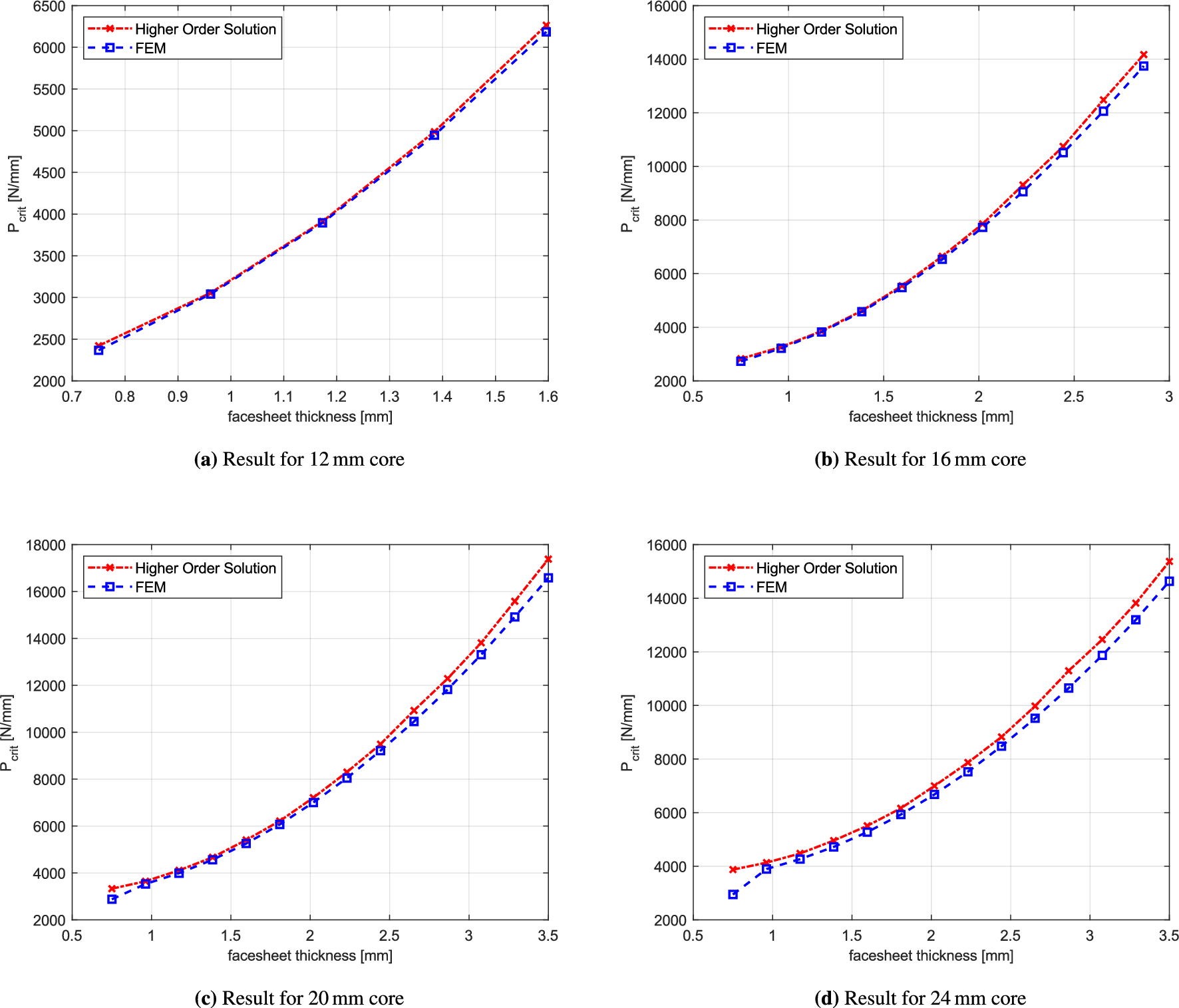 Further analysis at higher core thickness shows a slight divergence between the FEM and analytical results with increasing face sheet thickness. Nevertheless, the percentage error remains relatively low and within acceptable limits for the purposes of this study. It is also important to note that at a face sheet thickness of \(0.75\,\text {mm}\)–especially for core thicknesses of \(20\,\text {mm}\) and \(24\,\text {mm}\)–the deviation between the FEM and analytical predictions is most distinct. This may be attributed to the fact that this thickness range represents a transition regime between intracellularar buckling, typically observed for thinner face sheets (e.g., \(0.5\,\text {mm}\)), and thappearanceearance of dominant wrinkling behavior. Consequently, the wrinkling response in this intermediate zone may not fully conform to the assumptions underpinning either buckling mode.