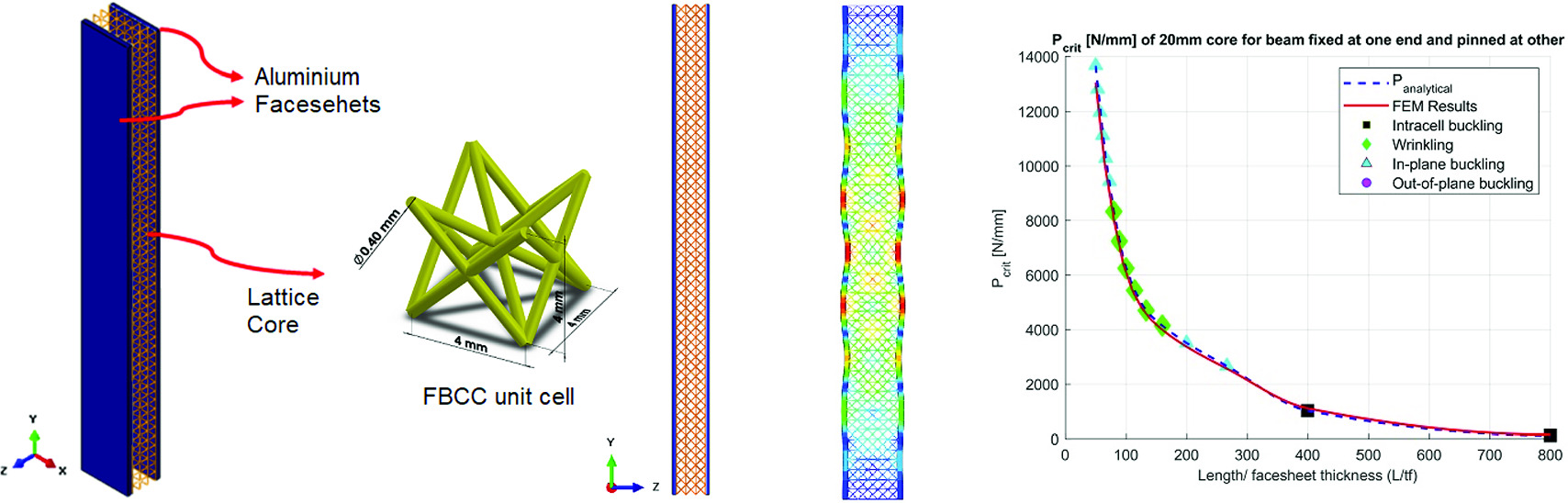Existing approaches, such as the empirical formulations by Norris and Kommers for honeycomb cores and Zenkert’s analytical solutions for corrugated cores, provide foundational insights into intracell buckling. The assumption of pin-jointed lattice structures by Deshpande and Cote aligns well with experimental observations. Among these, Zenkert’s formula is selected in this study due to its compatibility with the periodic and porous nature of lattice cores, offering a reliable estimation for critical intracell buckling loads.