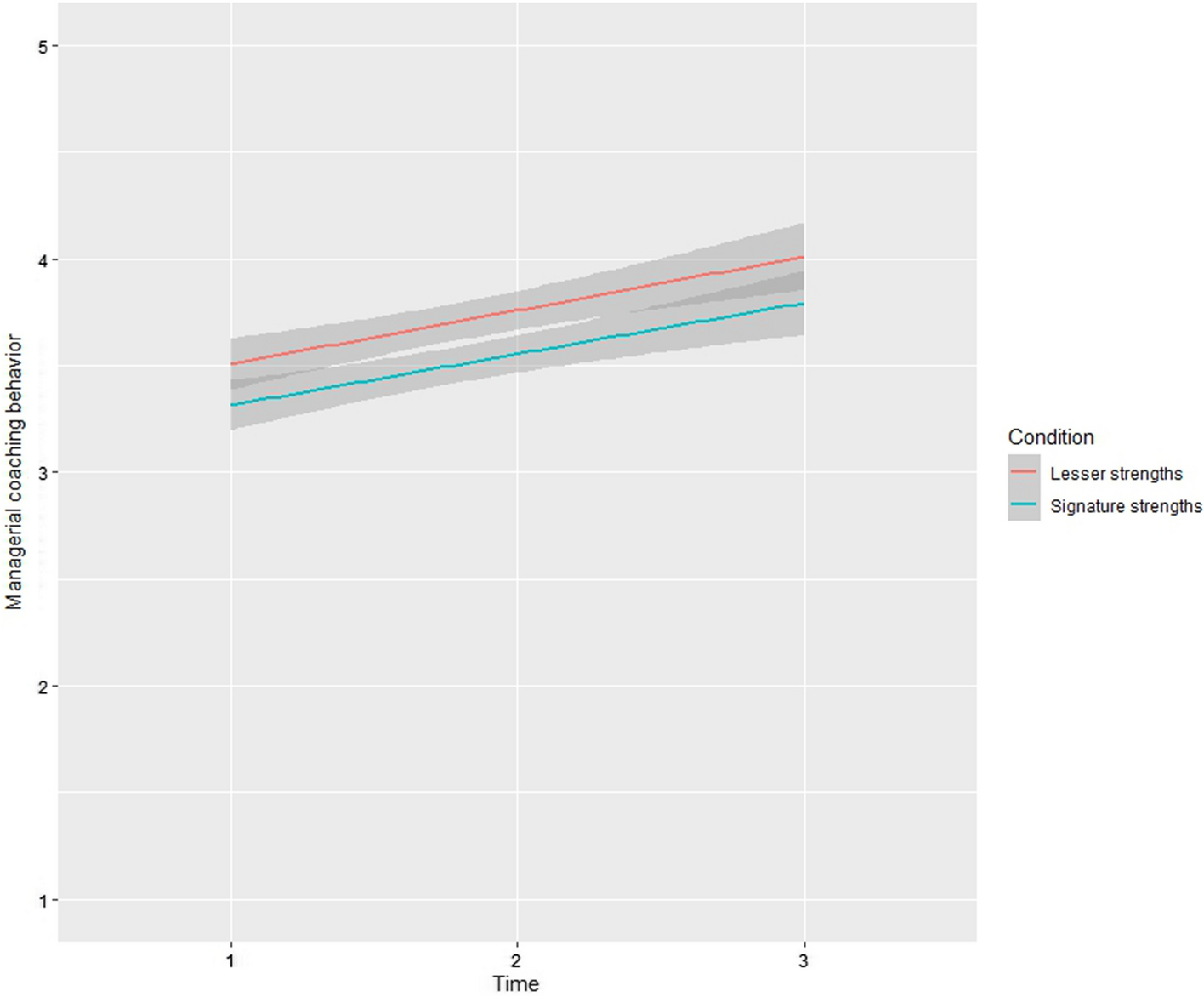 Participating in a signature strengths spotting intervention results in a stronger increase of managerial coaching behavior over time compared to participating in a lesser strengths spotting intervention.