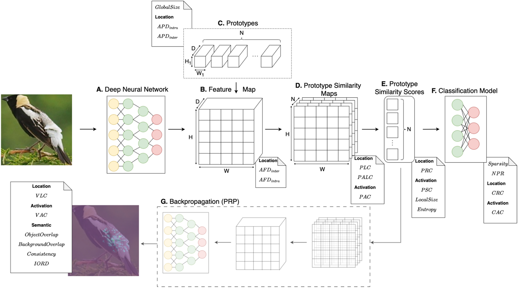 A visual representation of a prototype-based neural network. Starting from A a deep neural network, such as ResNet, extracting a feature map (B), the model identifies the presence of prototypes (C) by comparing them with feature vectors; generating similarity maps (D). Classification (F) is performed according to the highest similarity scores (E) derived from these maps. Prototypes are visualized (G) using the Prototypical Relevance Propagation (PRP) method. Note cards list the metrics that focus on that specific component. Some metrics are used in multiple evaluation techniques, which is later indicated by a subscript, see table 1