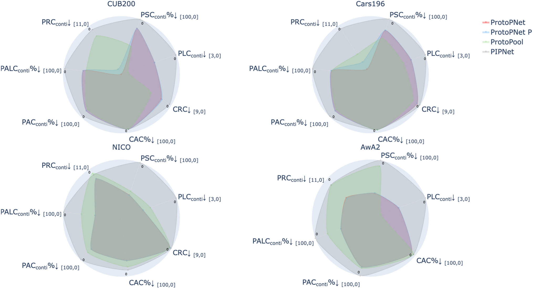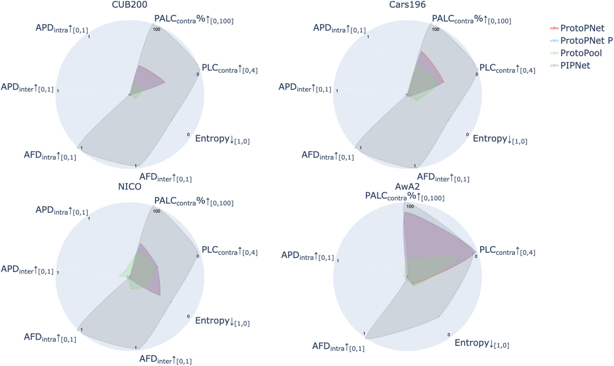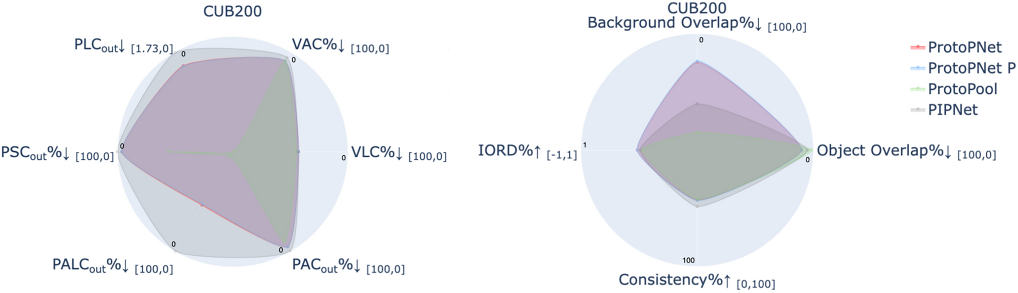 In this section, we discuss the techniques and metrics used to evaluate the part-based prototype models. Following the Co-12 properties from Nauta et al. [19] as a guideline, we choose metrics to evaluate the output-completeness, continuity, contrastivity, covariate complexity, and compactness.