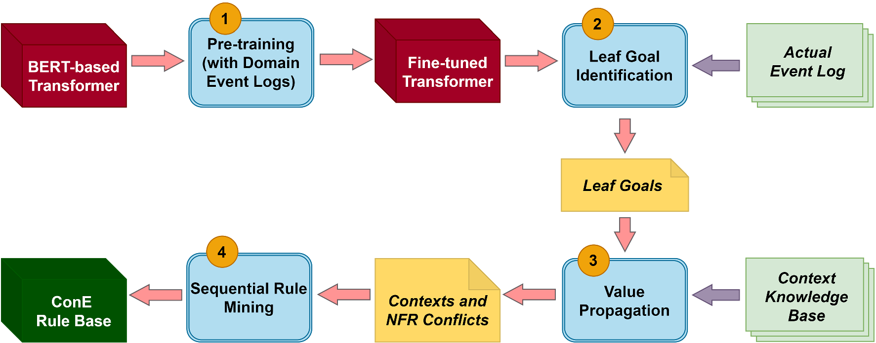Next, we deploy a BERT-based Transformer Model (BTM), pre-trained over existing event logs. This BTM identifies the leaf goals operationalized for a particular execution thread using semantic similarity. Based on the leaf goals identified, we observe the contexts that are activated at the variation points and the NFR conflicts that occur.