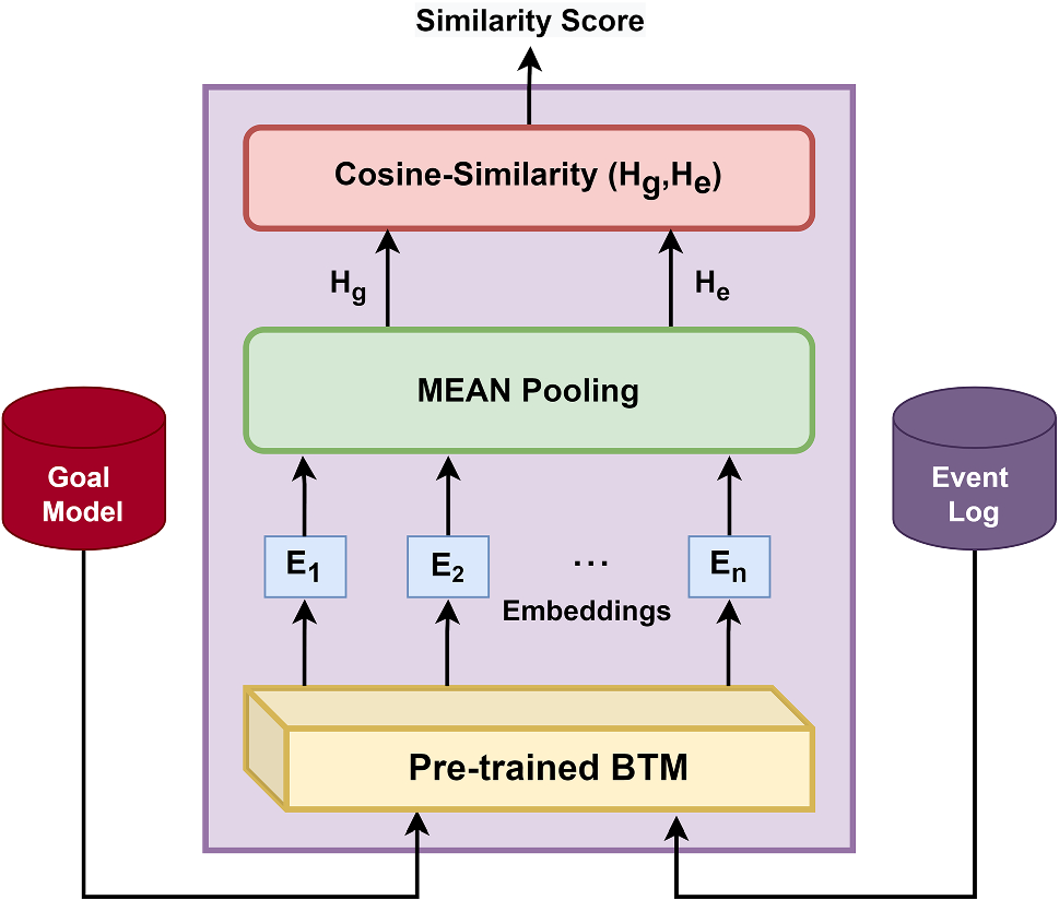 This is the sub-process (2) of the ConE framework shown in Fig. 1. The pre-trained BTM, derived from the first step, is further fine-tuned to be used in the goal identification process. This is done by using semantic similarity, as shown in Fig. 2. In the very first step of the fine-tuning process, the goals and event logs are fed into the pre-trained BTM. The transformer model accepts these inputs and generates token embedding. Pooling strategies generate fixed-sized sentence embedding (from token embedding) to perform certain NLP tasks—like classification, semantic similarity, and named entity recognition. There are two possible pooling strategies—MEAN Pooling and MAX Pooling—that are used for sentence representation tasks. Among these two strategies, MEAN Pooling performs better for sentence representation [41]. In case of MEAN Pooling, the instances of fixed-size sentence embedding are obtained by averaging the hidden state of encoding layer on the time axis. Finally, the cosine similarity is measured for these fixed-size sentence embedding to determine the semantic similarity between events and goals. The highest similarity measure determines the leaf level goal corresponding to a particular activity in the event log.