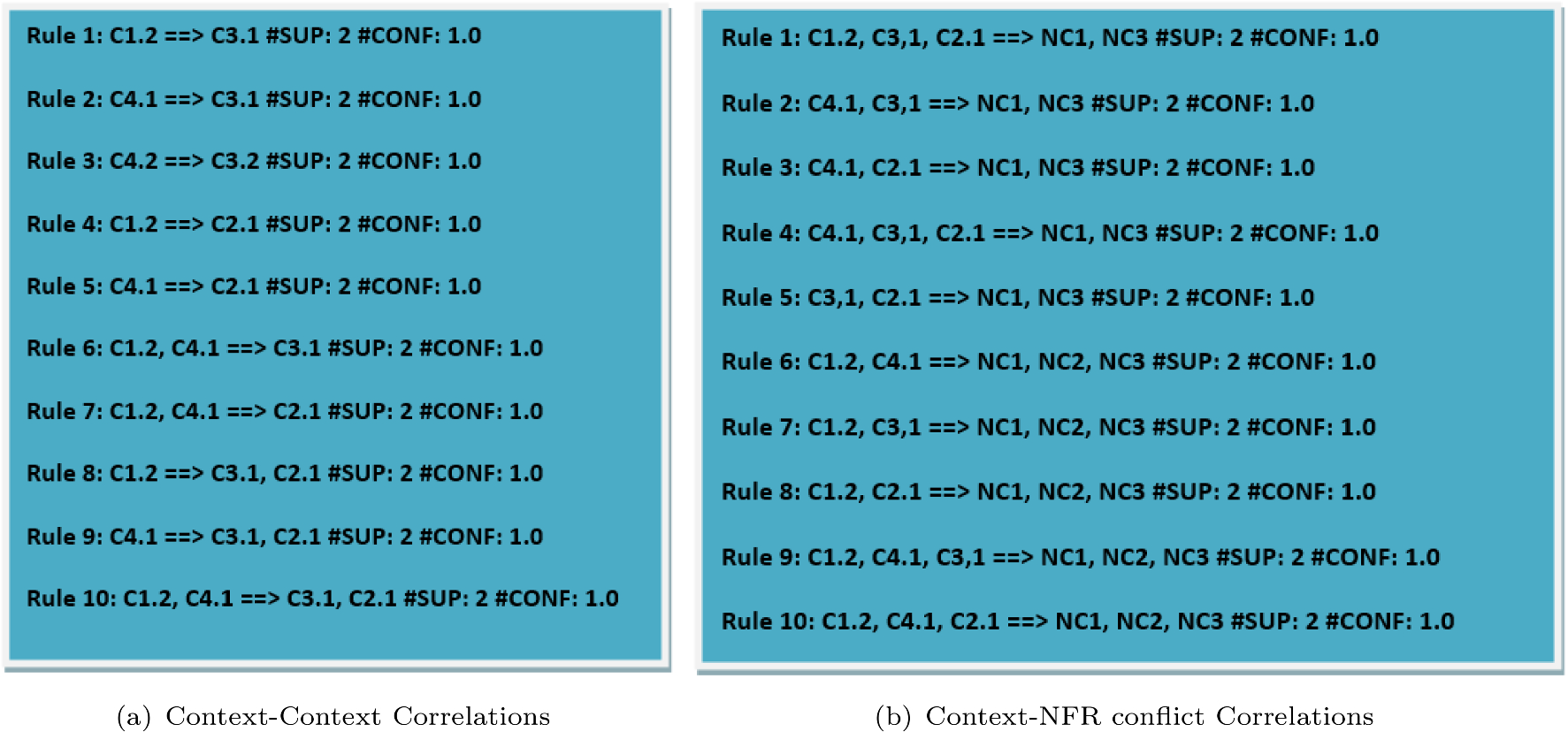 These data are then fed into the Sequential Rule Mining Framework of the SPMF library [9] for mining two types of sequential rules—(i) between individual contexts; and (ii) between contexts and NFR conflicts.