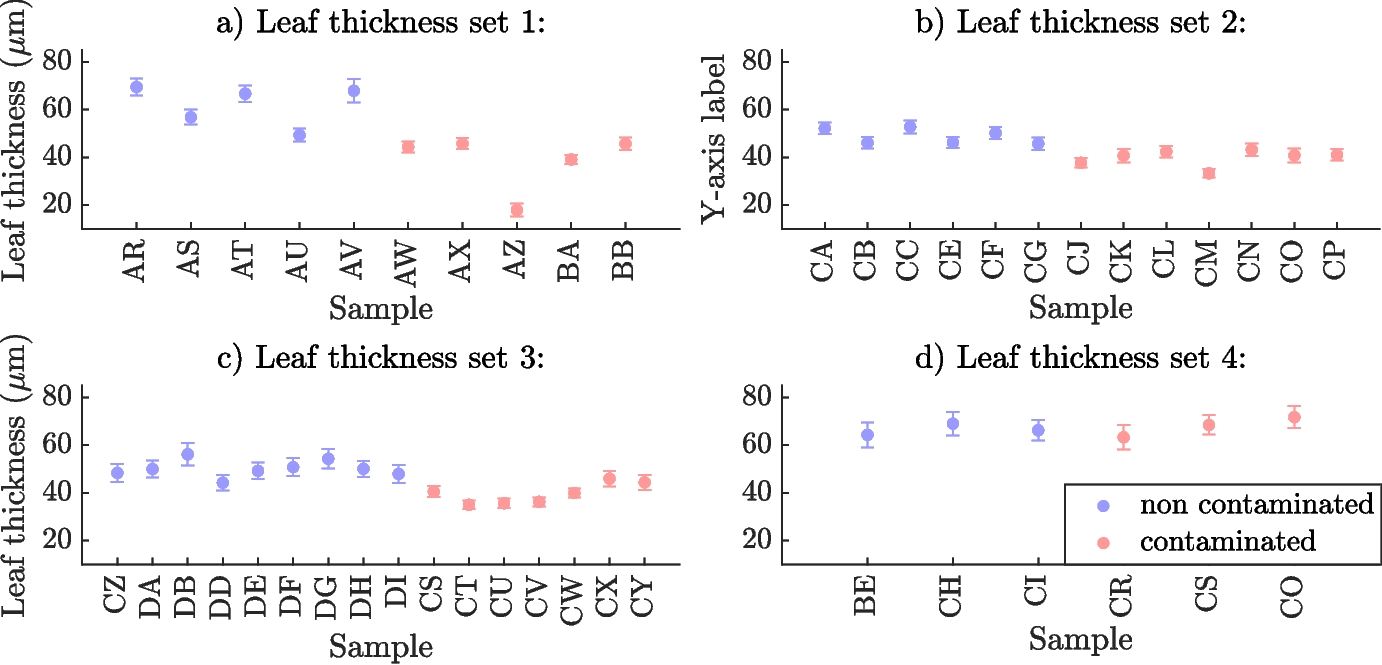 Across Sets 1 and 2, leaves from contaminated soil tended to be thinner than those from uncontaminated soil. This observation supports the hypothesis that prolonged exposure to heavy metals can affect plant morphology and structural development. In contrast, in Sets 3 and 4, thickness differences between treatment groups were less pronounced, likely masked by increased surface complexity and measurement variability.