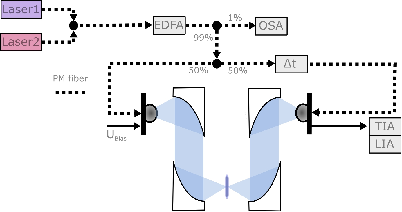 THz measurements were performed using a CW THz system based on optical heterodyning. Two near-infrared lasers with slightly offset wavelengths generate a tunable difference frequency in the THz range. The resulting beat signal is amplified using an Erbium-Doped Fiber Amplifier (EDFA) and then split into two arms (see Fig. 3).