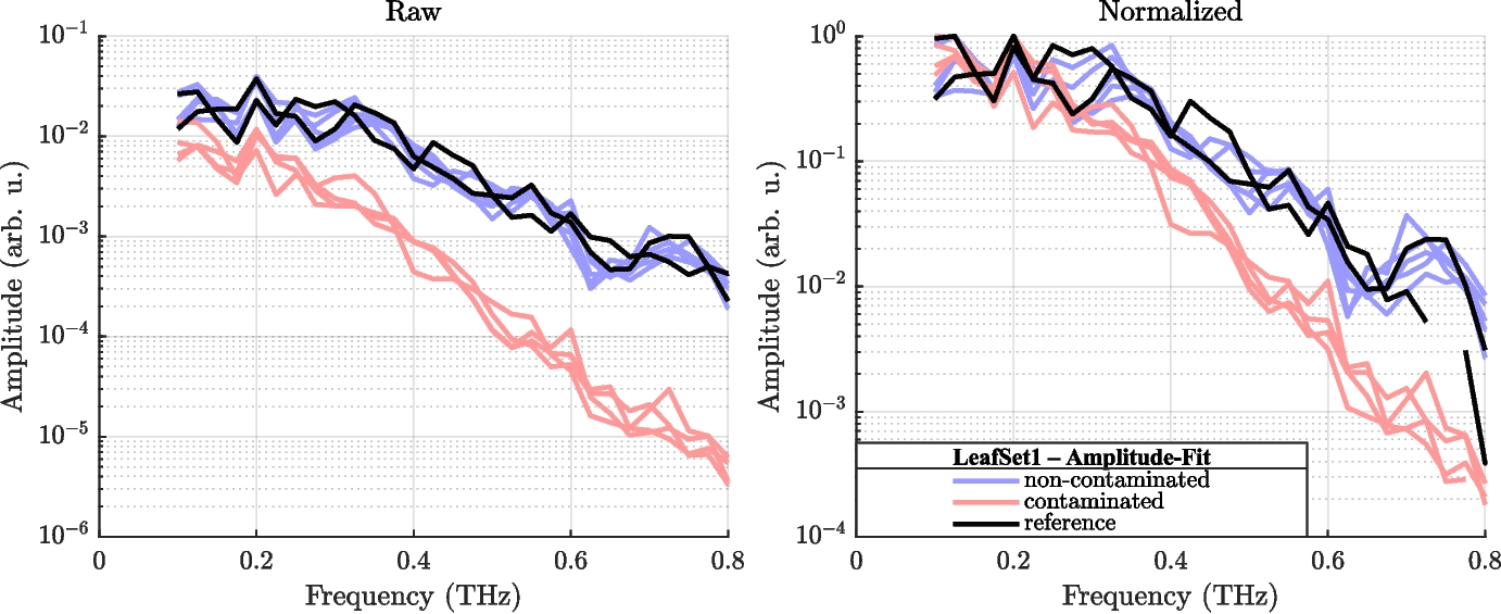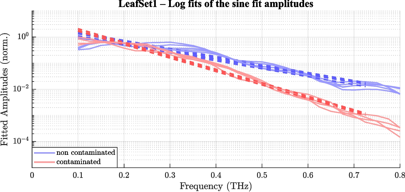 To evaluate differences in THz transmission spectra, each measurement was analyzed within the frequency range from 0.1 to 0.8 THz, discretized into 32 points. For each leaf at every frequency point, the amplitude of a sinusoidal fit to the time-domain signal was computed. These amplitudes were smoothed to reduce noise and normalized to the range [0,1]. To quantify the spectral shape, the normalized amplitudes were plotted on a semi-logarithmic scale (linear x-axis, logarithmic y-axis) (see Fig. 4). A linear fit was applied to the \(\log _{10}\)-transformed amplitudes within the linear portion of the spectrum to capture the overall spectral decay (log-linear slope). The resulting fit coefficient corresponds to the spectral slope in dB per decade. This procedure was applied to all measurements from dried leaf Sets 1–3. For each sample group (contaminated vs. non-contaminated), the distribution of spectral slopes was visualized using boxplots. A two-sided unpaired t-test with unequal variances was conducted to test for statistically significant group differences. A p-value below 0.05 is considered significant.