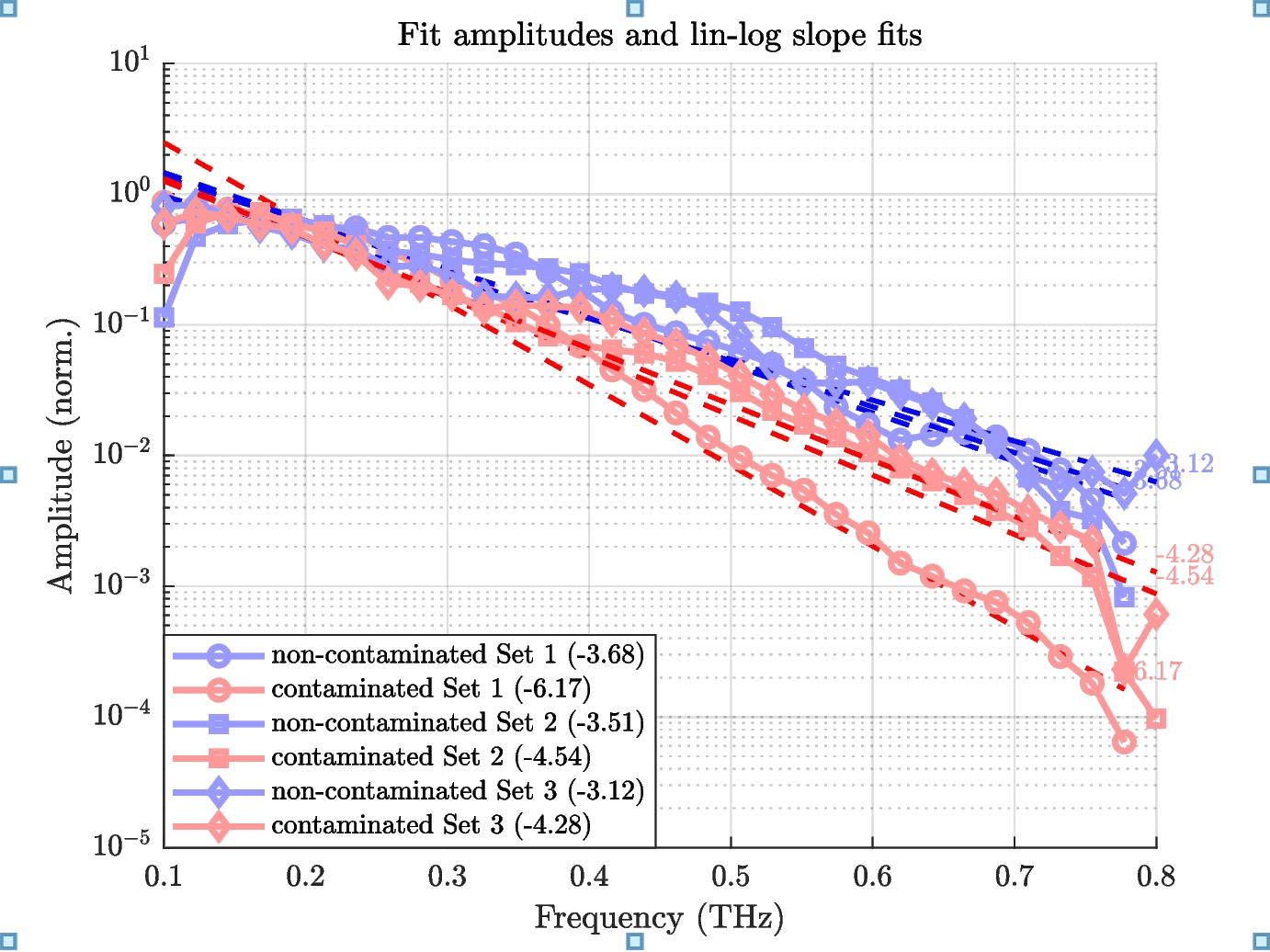 To quantify this observation, a linear fit was applied to the \(\log _{10}\)-transformed amplitude spectra over the range 0.1–0.75 THz. The resulting slope values reveal a significantly steeper decline in contaminated leaves, indicating increased absorption or scattering. Since all samples were identically prepared, the observed differences are unlikely to result from residual water content or surface variation.