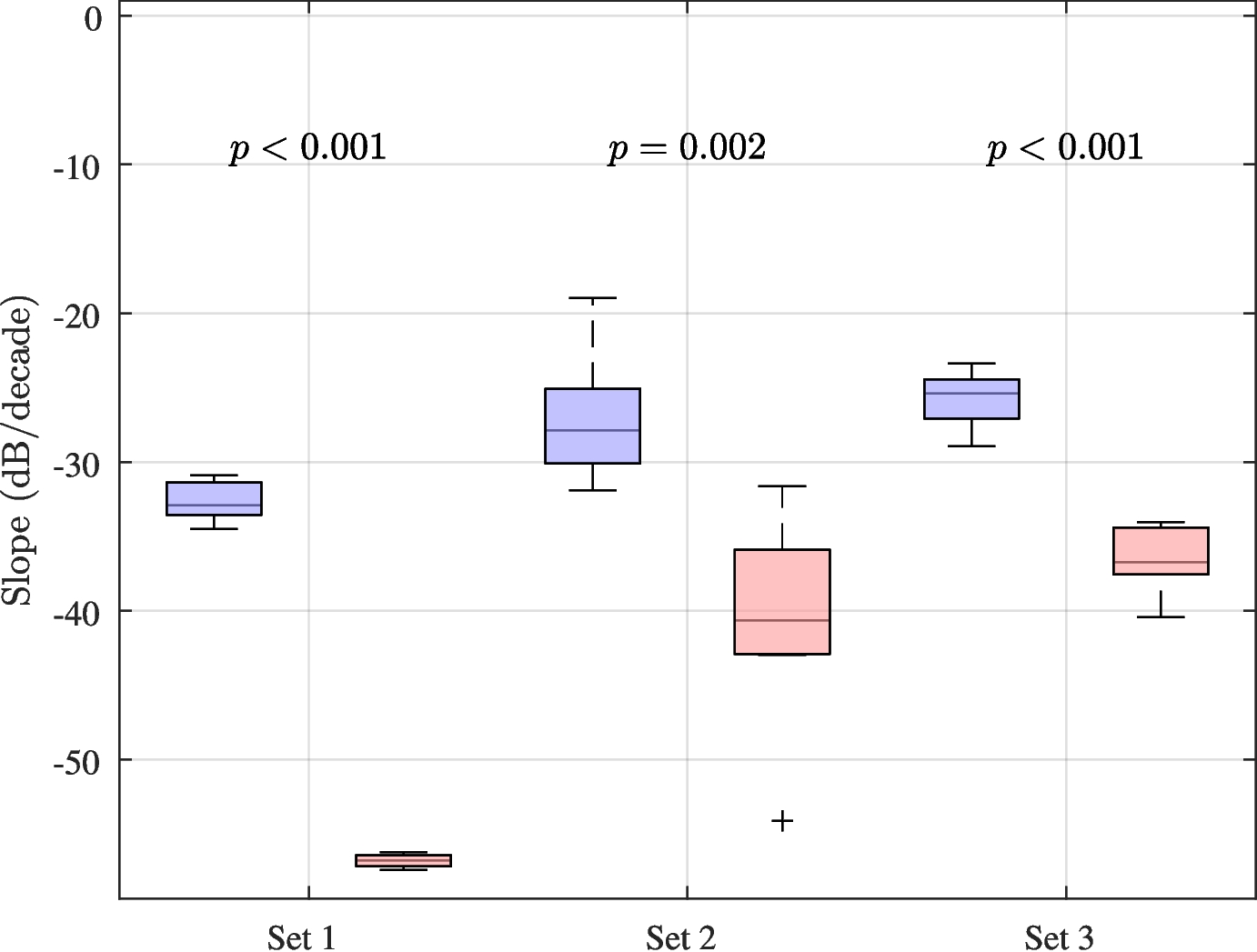 Figure 6 summarizes the group-wise mean spectra for Sets 1 to 3. Despite seasonal, aging, and preparation-related variations, all datasets consistently show a stronger spectral decay in contaminated samples. The slopes, shown in Fig. 7, were derived from quadratic polynomial fits in the log-lin domain. A two-sample t-test revealed significant differences between groups in each set (Set 1: \(p = 0.0159\), Set 2: \(p = 0.0131\), Set 3: \(p = 0.0026\)), confirming that spectral slope is a robust contrast metric under dried conditions.