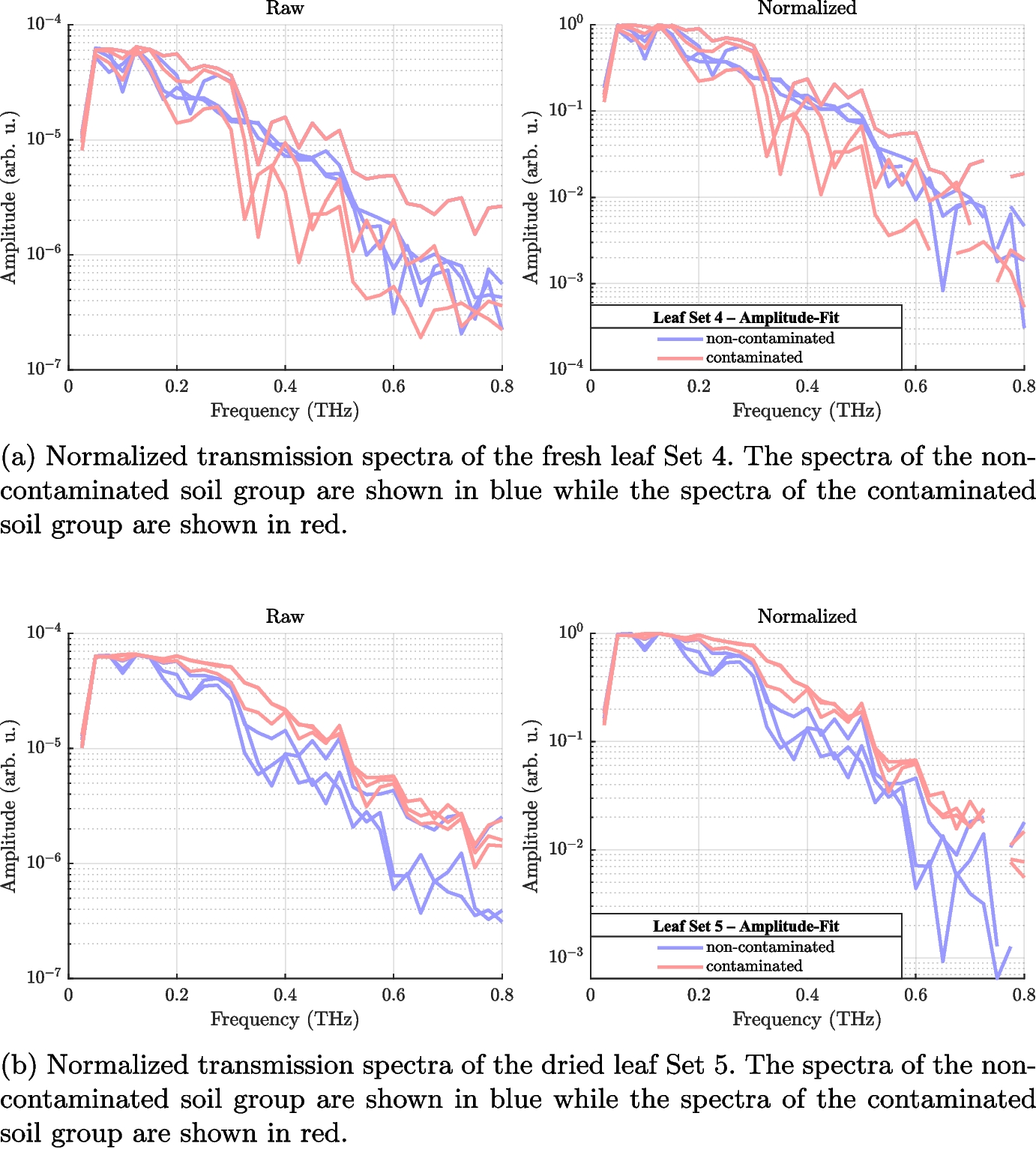 Representative spectral fit example for leaf Set 1. Normalized amplitude spectra (solid lines) and corresponding linear fits in the log-domain (dashed lines) are shown. Contaminated samples (red) exhibit steeper slopes and lower amplitudes than non-contaminated controls (blue), indicating reduced THz transmission