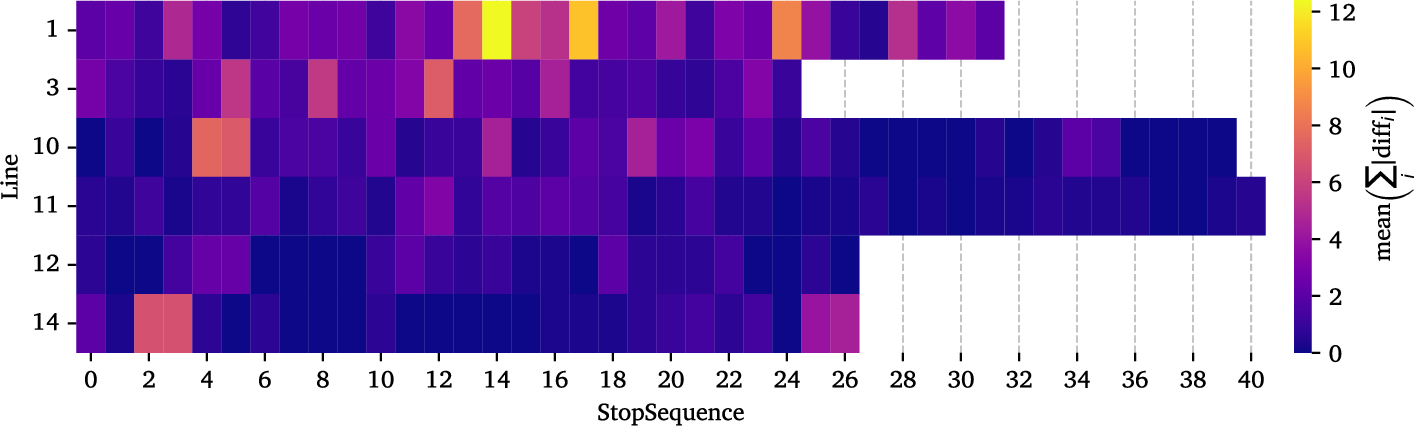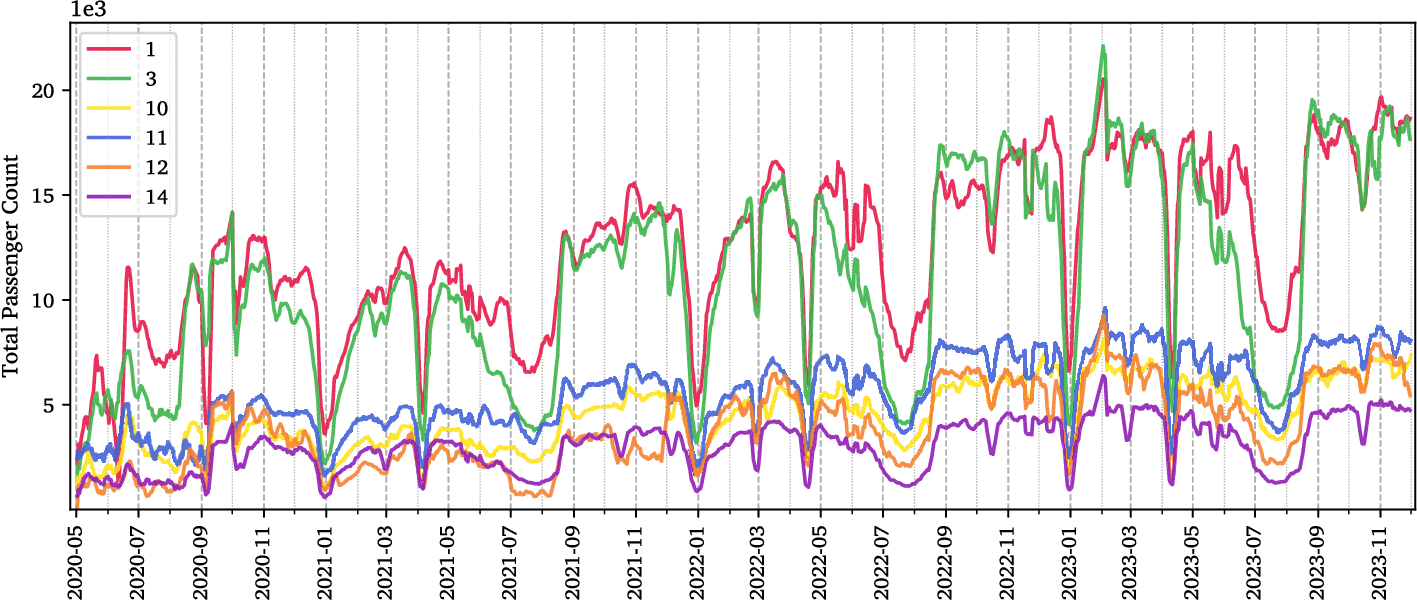 The study’s dataset covers the period from 1st May 2020 to 30th November 2023, comprising 1,179,770 unique trips over 1,295 days, across 6 lines and 204 stops in Trondheim Municipality. Each bus line has a set of routes (which vary based on seasons, construction works, etc.), and each route has a set of stops; the trip is defined as “the sequence of boarding and alighting counts at these stops for a given bus line and route.” As shown in Figure 3, the bus lines in the data cover a wide section of the city, most of them running through the city centre. The raw dataset features a comprehensive set of 63 attributes, providing insight into the temporal and spatial aspects of bus trips, passenger flow metrics, and various operational parameters.
