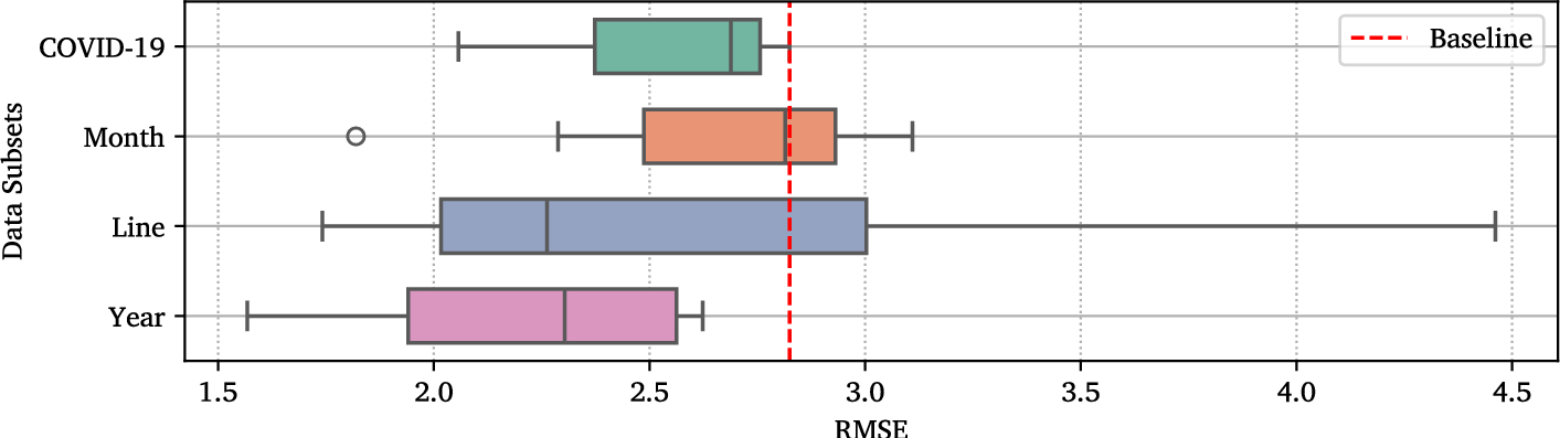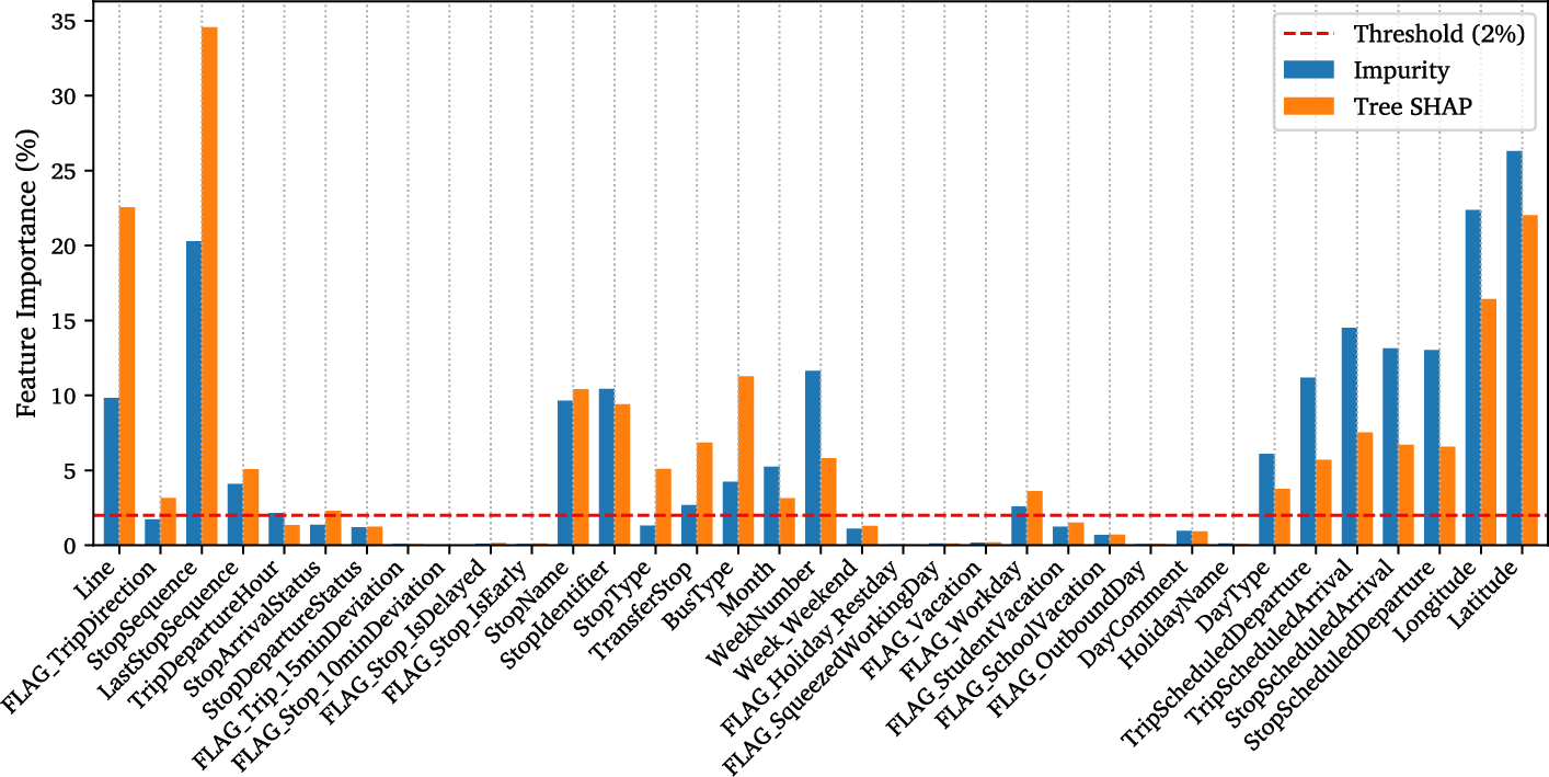 Several studies have also explored the influence of external factors such as weather, terrain, demographics, and land use characteristics on public transit, often outside the context of predictive modelling. These influences are typically regional-specific and can vary within urban areas. Tian et al. (2024) analysed the impact of extreme weather disruptions on public transit reliability in terms of predicted delays, while Alam et al. (2021) applied a similar framework to predict irregularities in bus arrival times based on hourly weather conditions. Wei (2022) and Ngo and Bashar (2024) investigated how (extreme) weather conditions affect travel behaviour in different categories of passengers and sociodemographic groups. Regarding urban characteristics, Kim and Li (2021) examined the complementary relationship between residential densification and public transit accessibility. Verma et al. (2021) decomposed ridership data into temporal demand profiles to identify clusters of subway stations, while Yang et al. (2023), Liu et al. (2023), and Zhang et al. (2025) studied the non-linear effects of the built environment on travel modes, trip duration, and ridership patterns. Other external factors that have been investigated include socio-demographics (Ma et al. 2024) and COVID-19 interventions (Zeb et al. 2024).