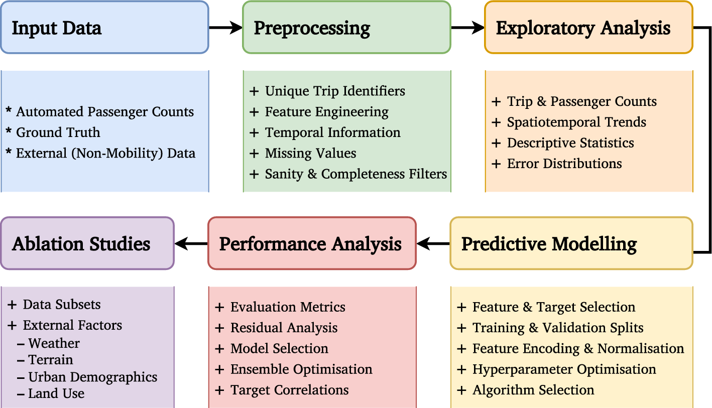 The rest of this paper is organised as follows: Section 2 provides the theoretical foundations of the study, discussing the ML/DL algorithms, training and evaluation metrics, hyperparameter optimisation, statistical significance testing, and ensemble learning methods used in the modelling process. Section 3 outlines the methodological framework, detailing the primary sources of big mobility data (APC and GT), feature space optimisation, training and validation procedures, model training pipeline, and feature engineering techniques. Section 4 presents the results of the predictive modelling for the APC and GT data, including performance evaluations, target feature correlations, statistical significance testing, ensemble optimisation, residual analysis and interpretability analysis. Section 5 discusses the feature engineering results, highlighting the effects of different external factors on baseline model performance and transit dynamics. Section 6 summarises the key findings, discusses the implications of the results, tackles the limitations of the study, and outlines potential directions for future research.