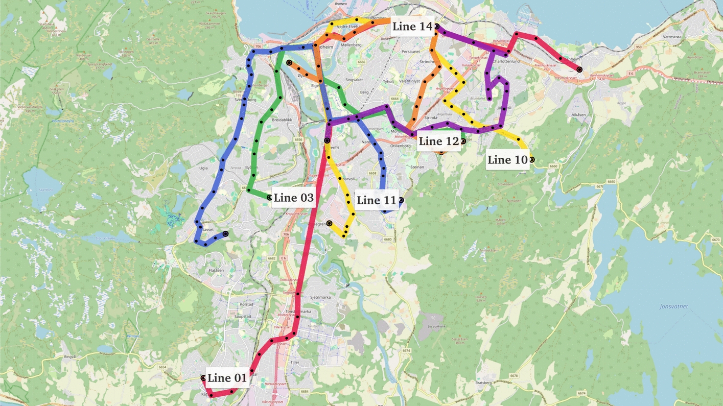 Satellite map showing the six bus lines included in the public transit dataset covering Trondheim Municipality